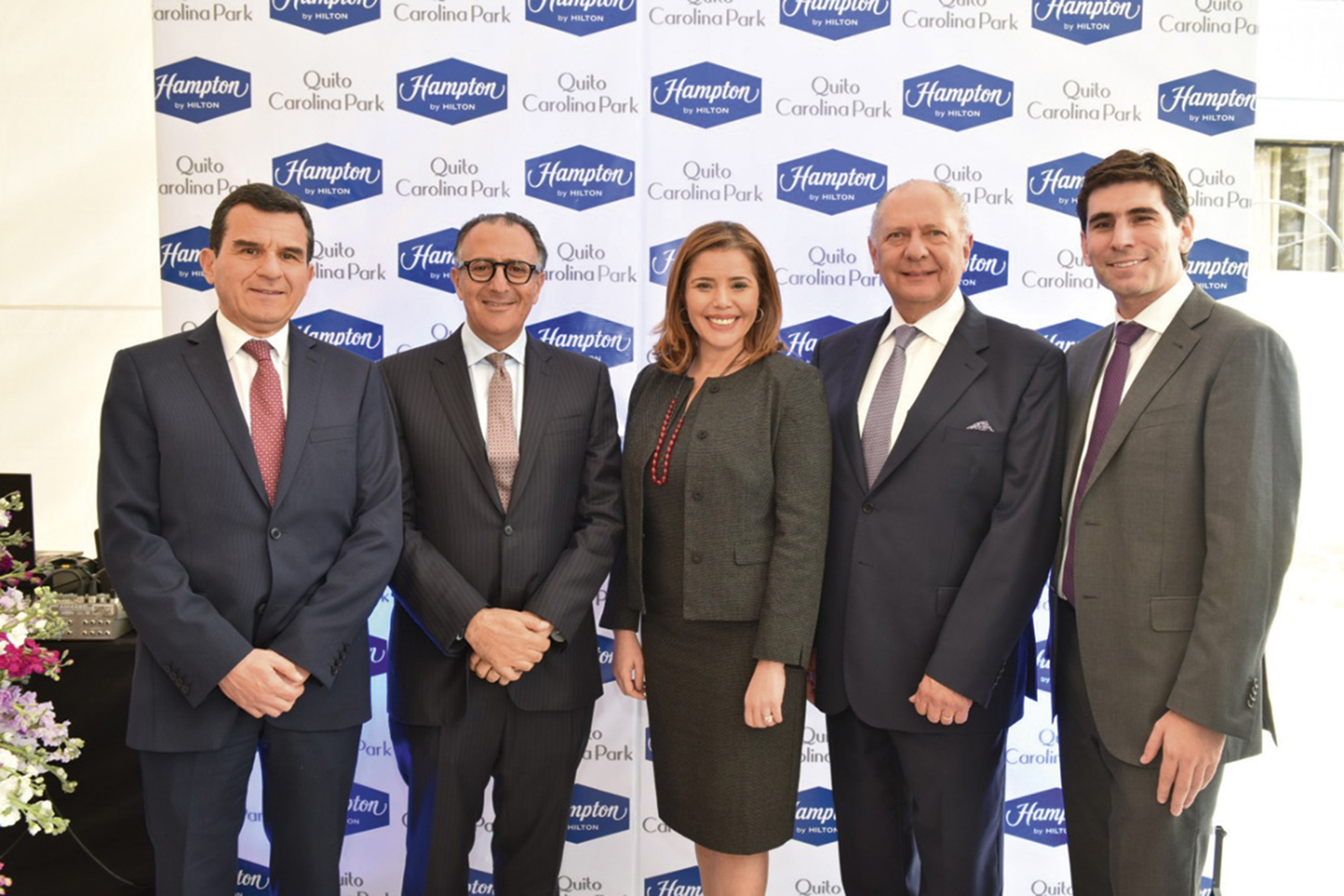 Patricio Jiménez, Gerente Hotel Hilton Colón Quito; Alberto Dassum, Presidente Hotel Colón Internacional; Giselle Albritton, Directora de Soporte para Hampton; Rafael Terán, Gerente General Hotel Colón Internacional; y, Pablo Maturana, Director de Desarrollo para Hilton