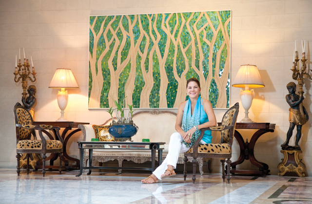 Continuando su aventura con cabuya, hoy la combina con vidrio cortado para lograr maravillosas obras de arte. El vestíbulo de entrada se ilumina con su última creación que se llama “El Bosque de Mandarinos”, un cuadro inspirado en el bosque que se encuentra en su finca, y en el que todas las ramas de los árboles crecen hacia arriba. En esta creación los árboles están hechos de cabuya, y el vidrio lo trabajó con una nueva técnica. “Puse a los vidrios más alargados, porque generalmente el mosaico es de 2cm x 2cm, y les he dado tonalidades de verde”. A este agrandamiento del vidrio lo bautizó con el nombre de la gran ciudad de los rascacielos, New York, porque el mosaico que arman luce como los edificios de la selva de cemento que la conforman.