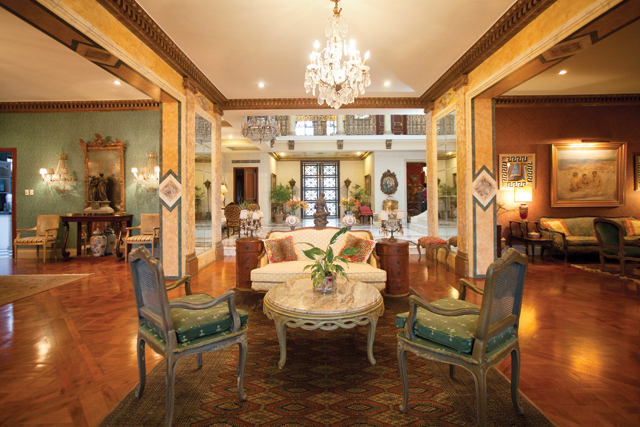 Al entrar, un vestíbulo de doble altura que mantiene armonía con los rasgos italianos de la fachada se despliega ante nosotros. Miramos en 360 grados y descubrimos que cada espacio tiene su elemento decorativo, cada rincón tiene un detalle. Resaltan los ventanales con vitrales de colores contrastando con los pisos de mármol. Paredes y techos lucen maravillosos tapices que se descubren entre columnas jónicas, mientras imponentes candelabros alumbran los amplios salones excepcionalmente distribuidos en la planta baja de la casa.