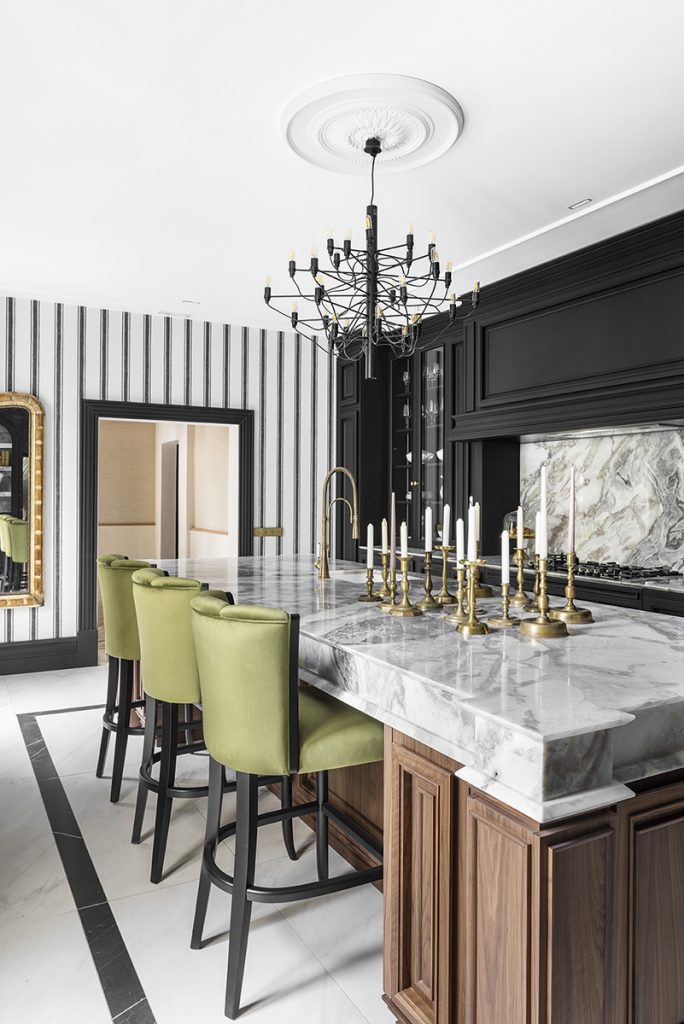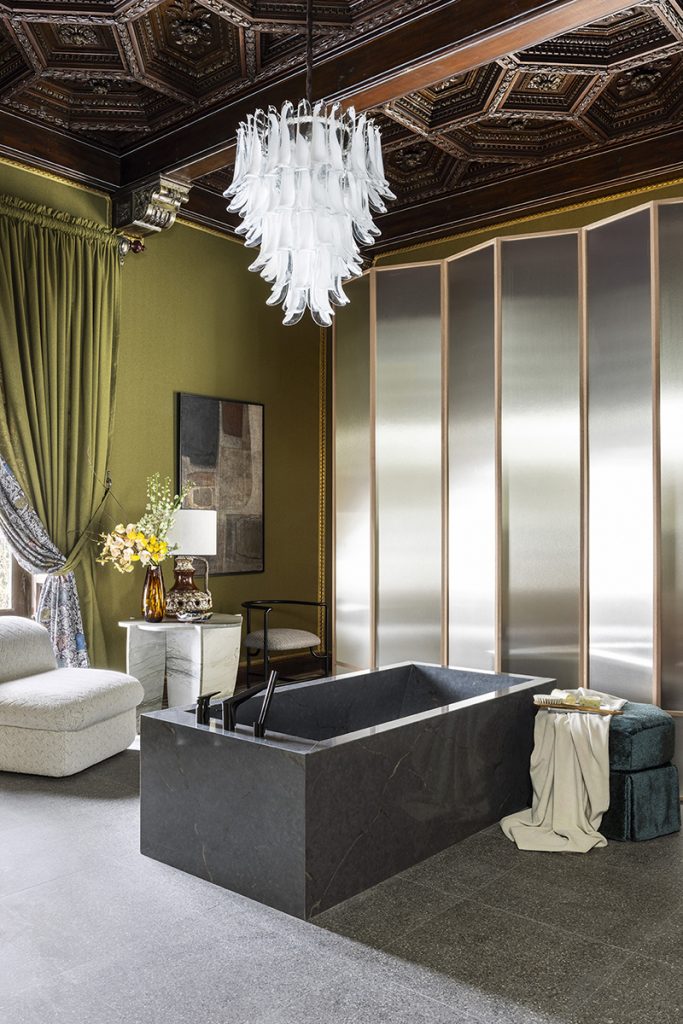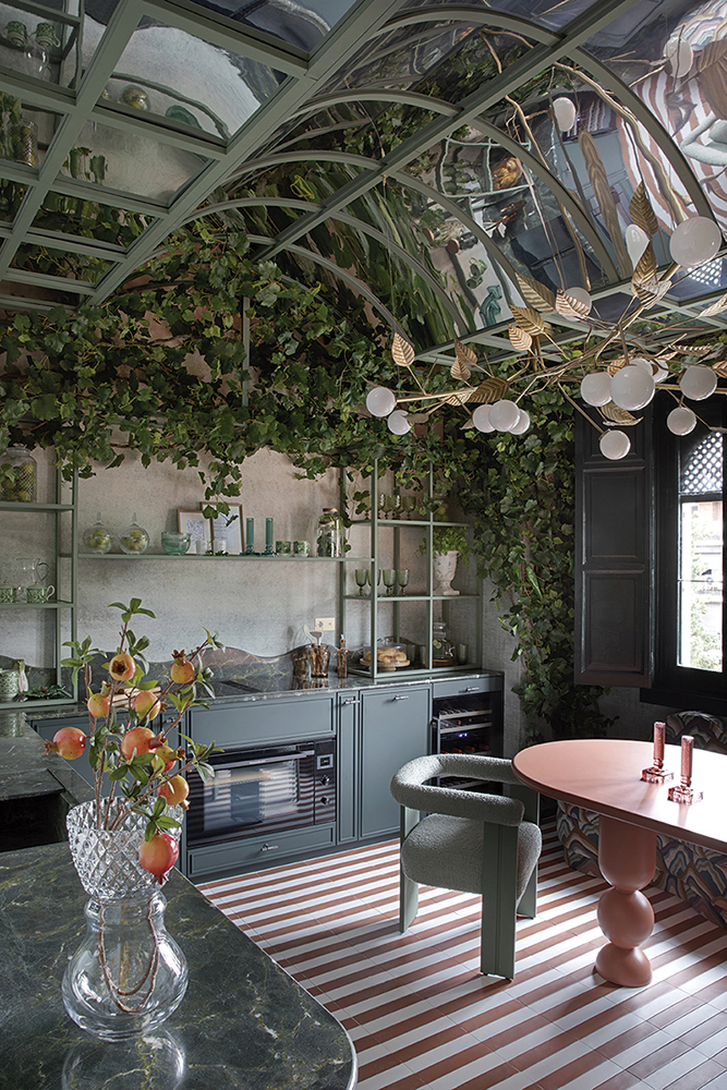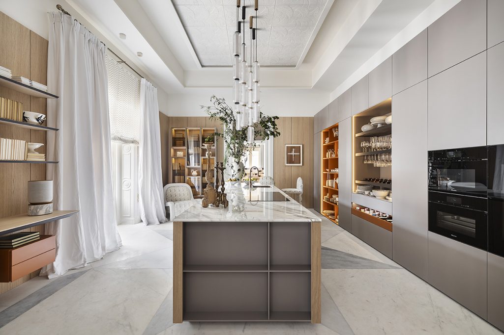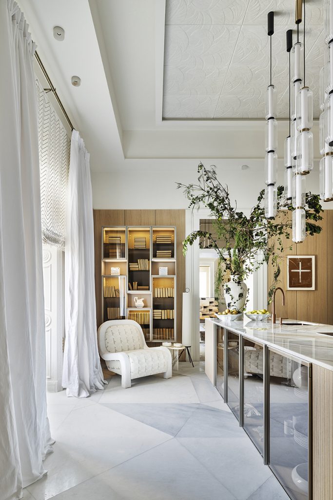 Destacan en este espacio la combinación de mármoles claros que componen el suelo, y el techo que tiene un artesonado realizado en tela lleno de volumen, mientras que en la cocina resalta la madera de roble con una altura de 3,2m. “Para mí era fundamental la buena convivencia entre los materiales. Tener una caja clara y neutra para lucir y destacar las maderas, lacas y metales de la cocina, que son todos de colores terrosos”.