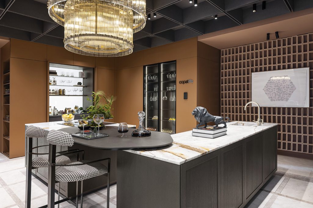 La esencia del ‘Espacio Arrital’ está marcada por piedra y madera, en concreto “los cuatro mármoles del suelo con acabado mate, junto con la encimera de la isla, en calacatta con toque teja con mucho brillo, y todo el roble que rodea perimetralmente el espacio”.
