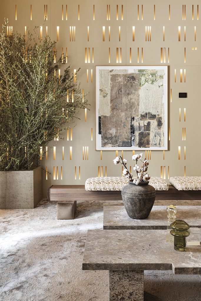 Los espacios de Raúl Martins generan cada año expectativa debido al buen gusto con el que cada detalle es emplazado. “En esta ocasión se trató de un espacio de casi 40m2, con techos a 4,5m. Aquí la escala ha sido fundamental, hay que controlarla para lograr un efecto proporcionado. Conjugar los materiales también pone en valor la propuesta en la que maderas, metales, lacas y piedra conviven en perfecta armonía”.
