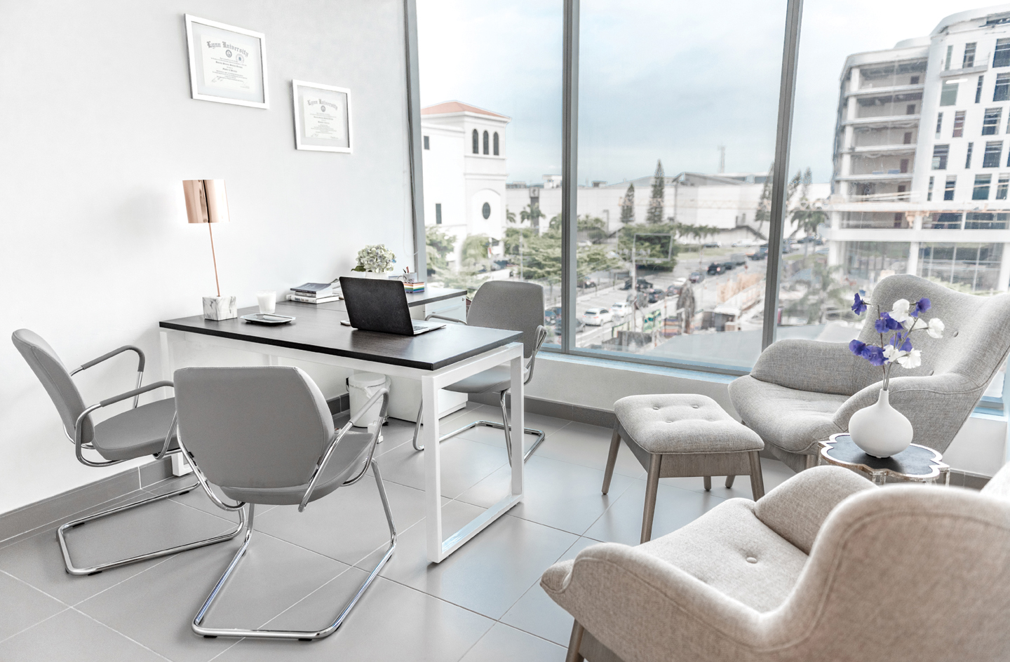 En el entorno se distingue el acero cromado, enchapes claros, grandes ventanales, mucha luz natural, mobiliario en tonos grises y neutros con ligeros toques de color en ciertos elementos. El papel tapiz en tonalidades sobrias impera en el área de consultorios.