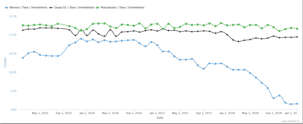 En el siguiente gráfico vemos el comportamiento de las tasas de interés para cada uno de los tipos de entidad financiera analizados. Se evidencia que la tasa promedio ponderada de Bancos ha bajado considerablemente. Su pico en el período fue 10.89% el 30 de noviembre de 2015, y cierra diciembre 2018 en 9.15%. Las tasas de Cooperativas y Mutualistas se mantienen estables. Sin duda la reducción de la tasa para este tipo de créditos por parte de los Bancos refleja un interés de incrementar su participación de mercado.