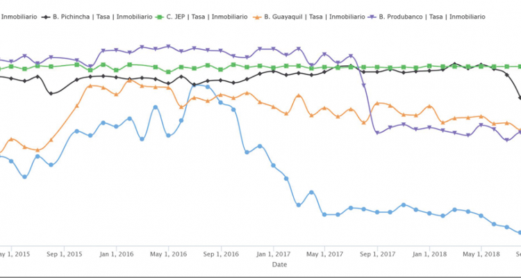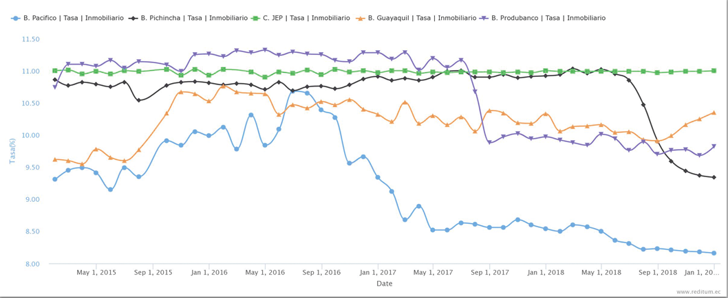 La entidad que realiza los préstamos inmobiliarios más baratos es Banco del Pacífico. La tasa a la que desembolsó durante diciembre 2018 fue de 8.16%, siendo la más baja para el período analizado entre las cinco entidades.
