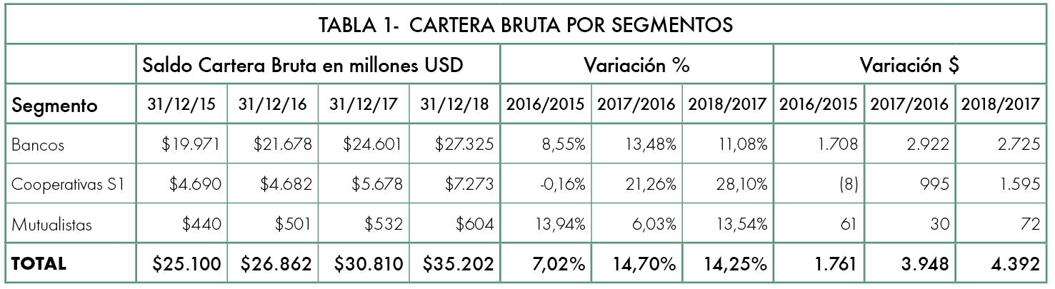 La cartera bruta cerró 2018 en $35,202 millones, lo que representa un crecimiento de 14.25% o $4,392 millones durante el año. De los tres segmentos, el que más creció fue el de Cooperativas S1 que cerró 2018 con un crecimiento de 28%, seguido por las mutualistas que crecieron 13.54% y los bancos con 11%. Los bancos fueron el único segmento que creció menos en 2018 que durante 2017.