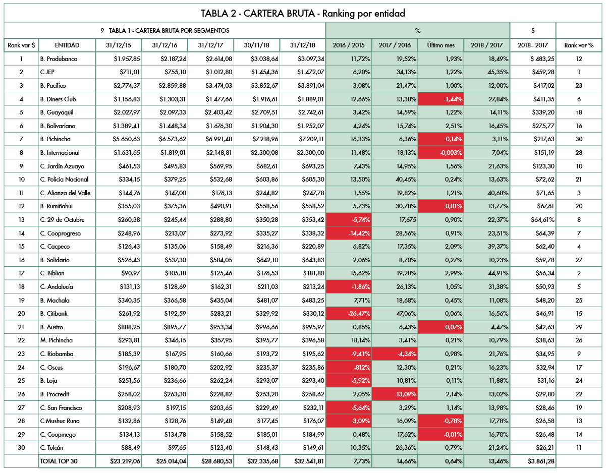 Ahora analizamos las cifras en términos de entidades. Nos enfocamos en las 30 con saldo de cartera bruta más alto al cierre de 2018, y analizamos su comportamiento durante el período.
