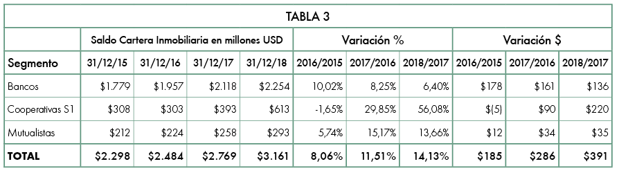 La cartera inmobiliaria creció $391 millones durante 2018, marcando de esta manera el tercer año consecutivo en el que crece más que el año anterior. Sin duda un comportamiento positivo para la actividad inmobiliaria. De esos $391 millones, $220 millones corresponden al crecimiento generado por Cooperativas, $136 millones por Bancos, y $35 millones por Mutualistas. En el período analizado, 2018 es el primer año en el que las Cooperativas crecen más que los Bancos en términos de valores en dólares.