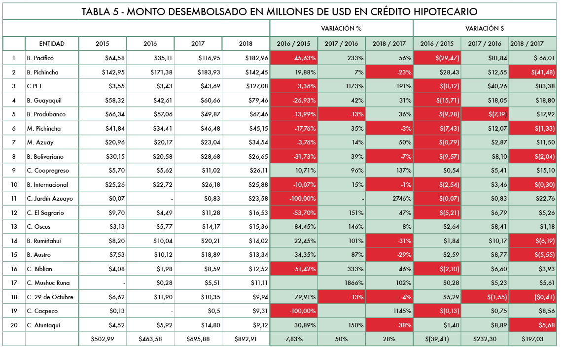 El cuadro a continuación nos permite analizar el comportamiento de los desembolsos de las veinte entidades que más dinero entregaron en créditos inmobiliarios durante 2018. De estas, diez son Cooperativas, dos Mutualistas, y ocho Bancos. Las tres entidades que más desembolsaron son Banco del Pacífico ($182 millones), Banco Pichincha ($142 millones) y Cooperativa Jep ($127 millones). De los tres, solo Banco Pichincha desembolsó menos de lo que había desembolsado en 2017.