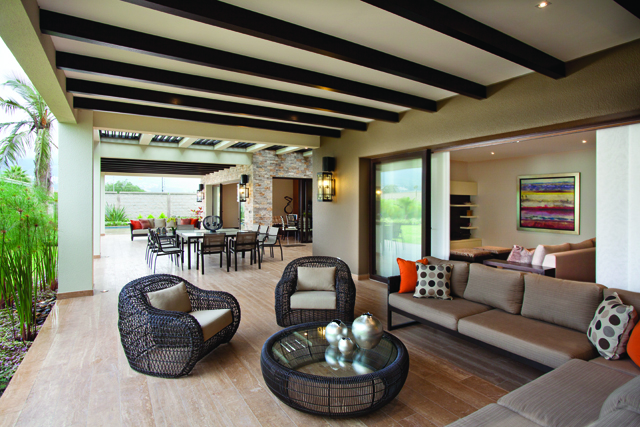 Se trabajó la arquitectura con una fachada exterior que se presenta discreta, para luego abrirse con grandes ventanales hacia el jardín interior, presentando a la pérgola como el punto de transición entre la casa y el área de piscina y jardín, que cuenta con jacuzzi y bbq. El estilo de vida refleja que “out is in”.
