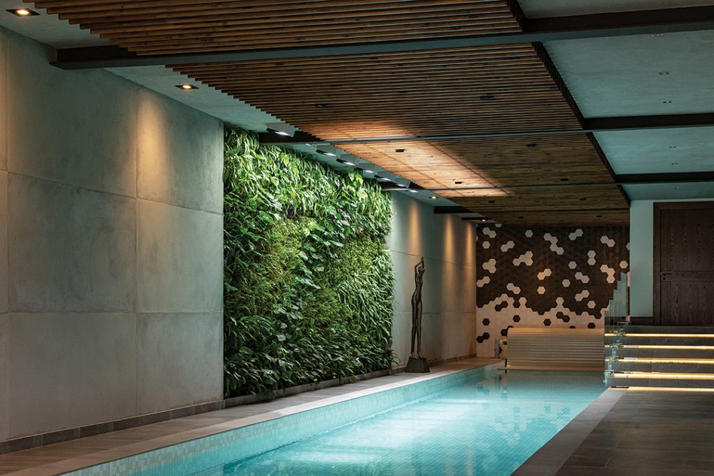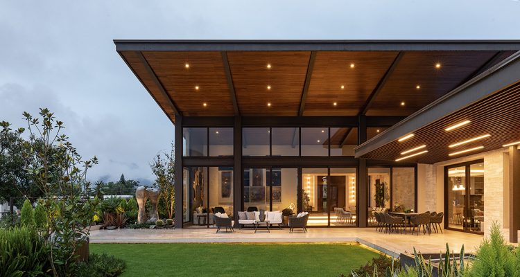 La sala principal cuenta con el detalle arquitectónico más importante: la cubierta inclinada con un volado de cinco metros, fue todo un reto estructural que valió la pena. Esta cubierta cae sobre el porche que es una continuación de la sala y comedor principal. En el subsuelo contamos con una piscina de 25 metros para las actividades deportivas del cliente.