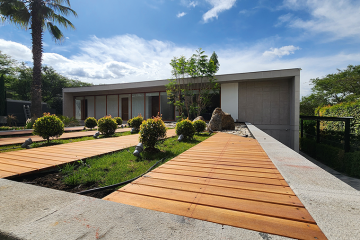 Diseñada con un estilo contemporáneo de líneas limpias y frescas, esta residencia se encuentra en un entorno natural privilegiado. Con una distribución de un solo piso, aprovecha al máximo su ubicación elevada para ofrecer vistas impresionantes de los alrededores. Grandes ventanales de piso a techo inundan los espacios interiores con luz natural y enmarcan el paisaje verde que se extiende más allá. El uso estratégico de materiales como la piedra, el vidrio y la madera crea una estética elegante y atemporal que se integra armoniosamente con el entorno.