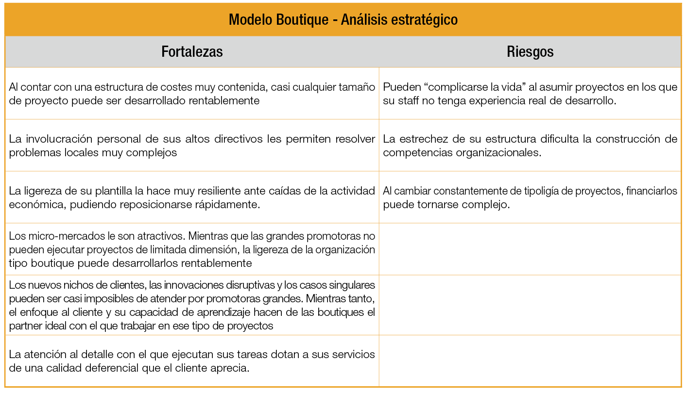 Desde una perspectiva estratégica, cuatro son las aproximaciones básicas aplicables en el sector, que conceptualmente podemos identificar como de boutique, titán, urbanizador y challenger. Ninguna de ellas es mejor que las otras, ya que todas tienen asociadas interesantes oportunidades de negocio y crecimiento, pero también sus propios riesgos.