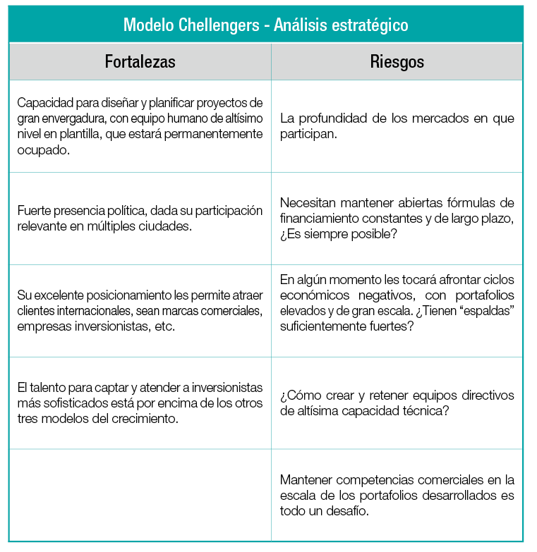 Finalmente, los challengers protagonizan el modelo estratégico más complejo de todos, ya que este tipo de desarrolladores busca multiplicar la cantidad de proyectos, sin preocuparse demasiado por la escala de los mismos. Es un promotor que reta los convencionalismos y las posibilidades de sus propios mercados. Su equipo directivo es el más sofisticado de la industria y cuenta con fuerte músculo financiero, lo que les permite apostar por proyectos de medio y largo plazo.