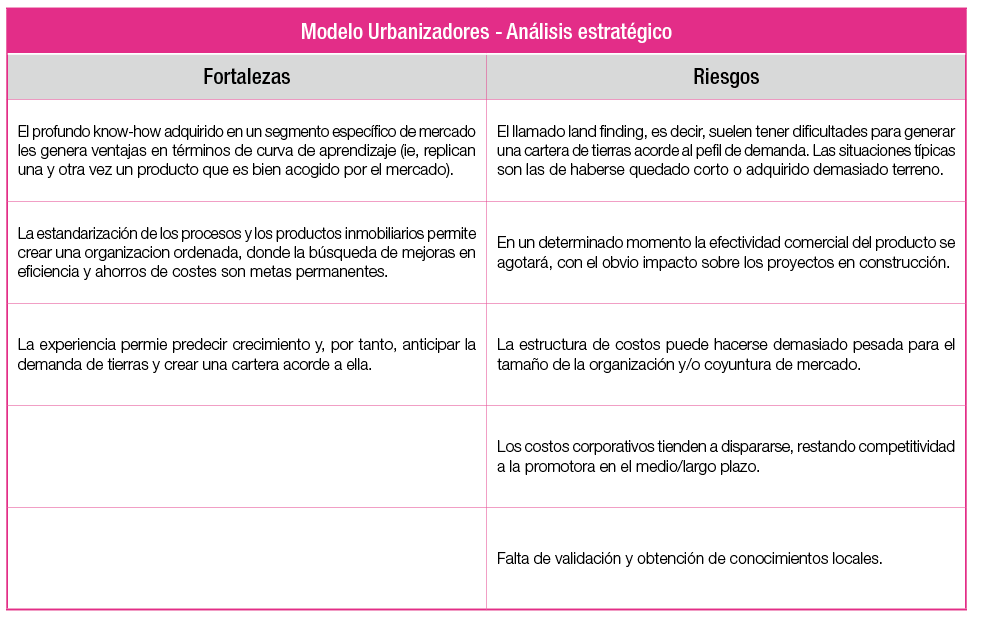 El modelo de negocio seguido por los urbanizadores se basa en la ejecución simultánea de múltiples proyectos homogéneos. Como si se tratara de una fábrica, este tipo de desarrolladores busca iniciar constantemente proyectos similares, en los que pueda aplicar los principios de estandarización de procesos. De este modo, minimizan cualquier pérdida inesperada, facilitan la creación de una cultura corporativa y de unos “modos de hacer las cosas”, a la vez que aumentan la transparencia y reducen la variabilidad existente en la ejecución de los trabajos.