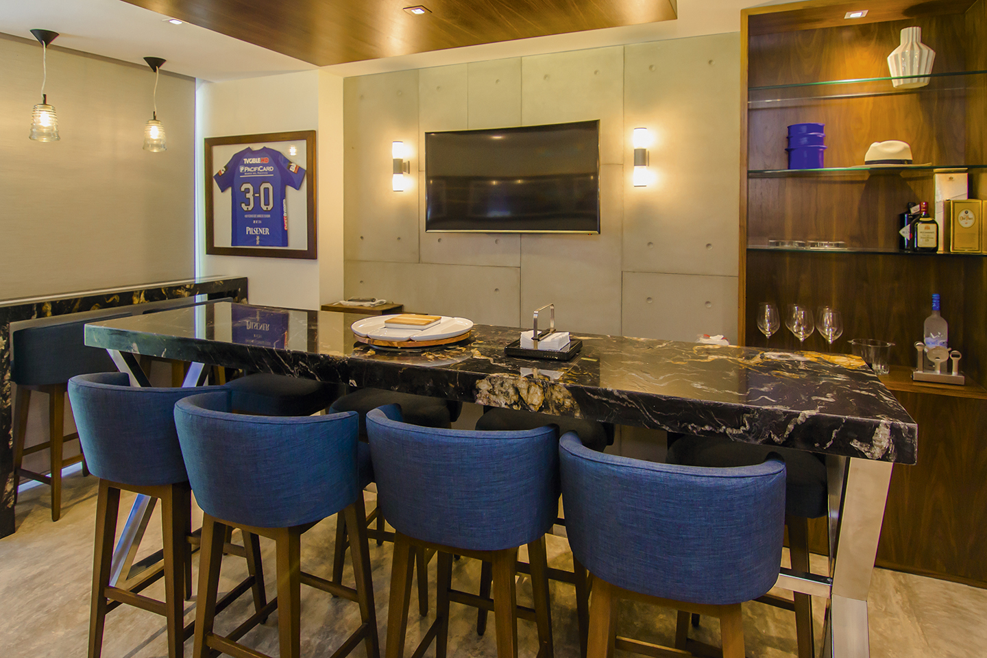 Proyecto Suit para los amantes del fútbol. Mesa-bar de mármol y patas de acero inoxidable. Bancos de bar con espaldar. Pared con diseño en placas de hormigón. Piso de cemento pulido y detalle en el tumbado con luz indirecta. Un espacio estético donde se puede disfrutar de esta pasión con estilo.