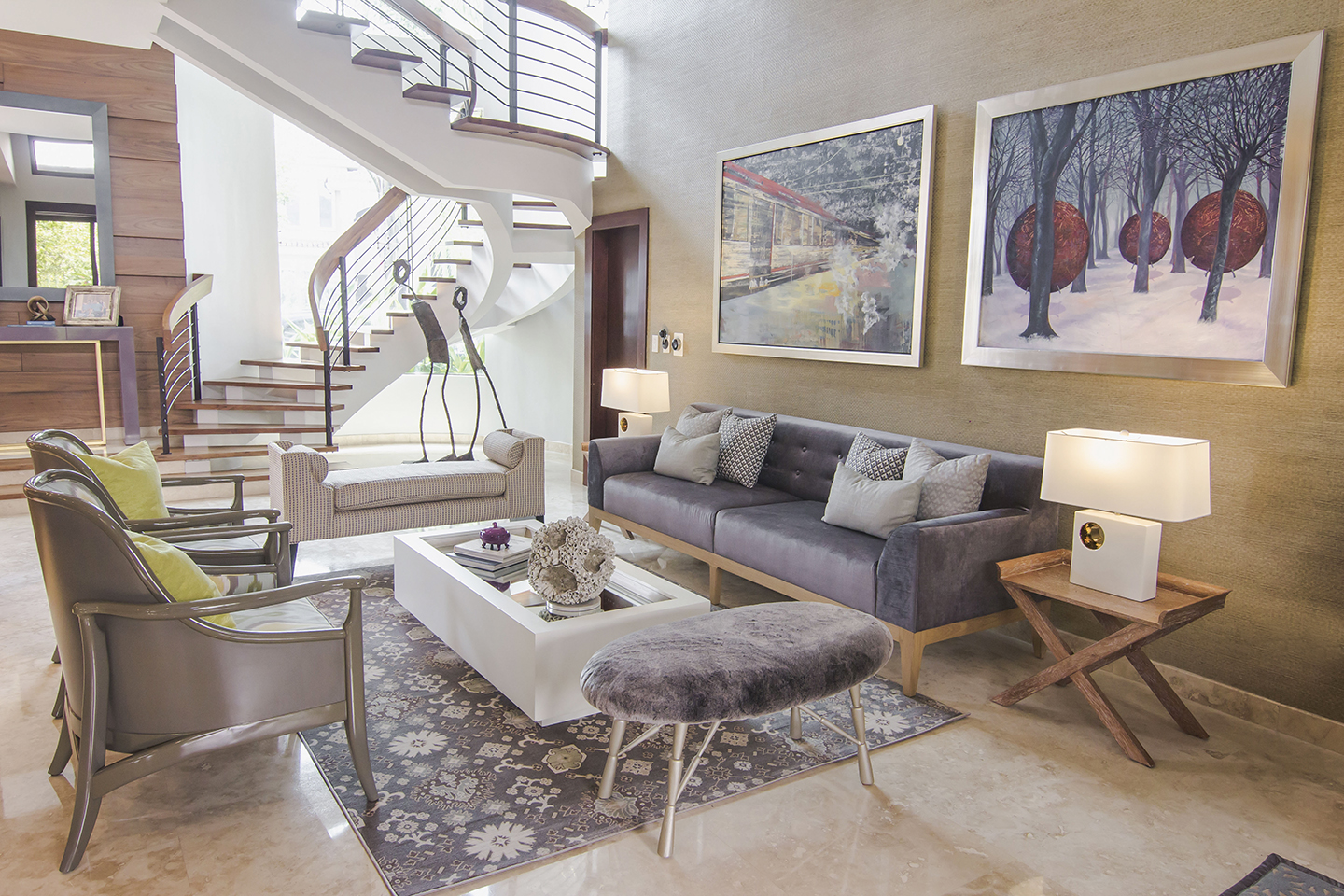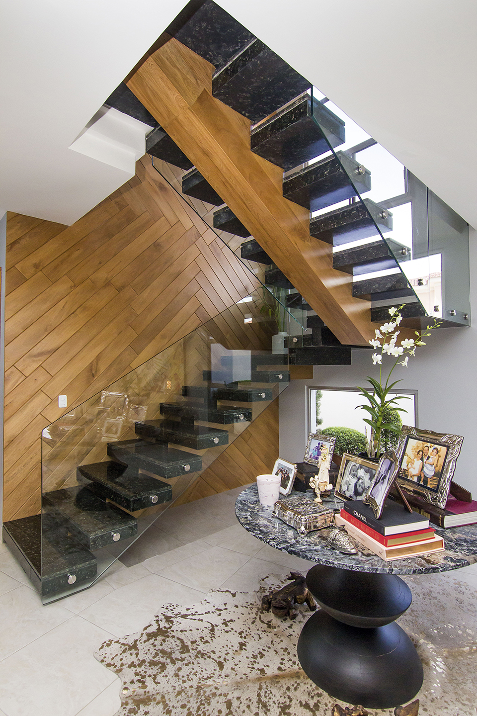 El siguiente, es el reflejo del trabajo en equipo realizado con los dueños de casa. Ejemplos de arte se exponen en cada rincón. Es un espacio lleno de claridad y texturas, como en este maravilloso detalle de escalera donde se fusiona la madera al natural, con granito y vidrio. Logrando que cada proyecto tenga la esencia de quienes lo habitan.