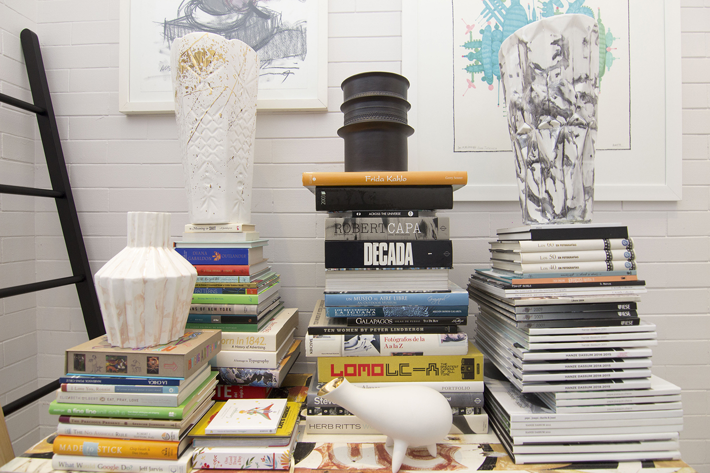 Colección de cerámica Amha Home hecha a mano con cerámica de alta temperatura. Jarrón geométrico (blanco con rosado), florero geométrico (negro con blanco), florero bohemia (alto blanco con toque de oro) y florero dots grande en negro mate.