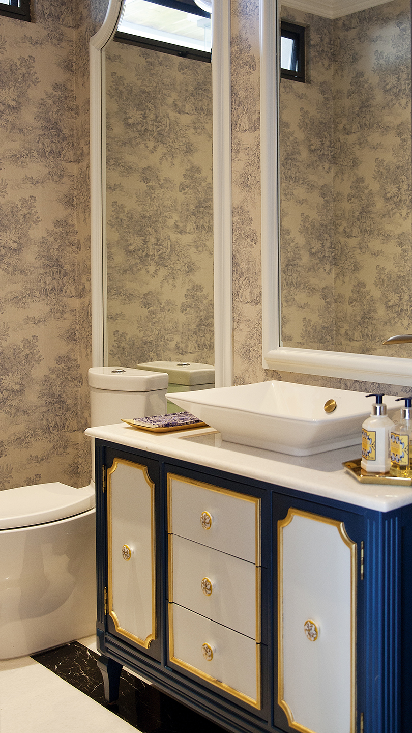 Baño estilo francés con detalles de molduras y paleta de materiales clásicos: metal dorado, porcelana blanca, mármol blanco con negro, laca azul cobalto y papel tapiz estilo Toile de Jouy.