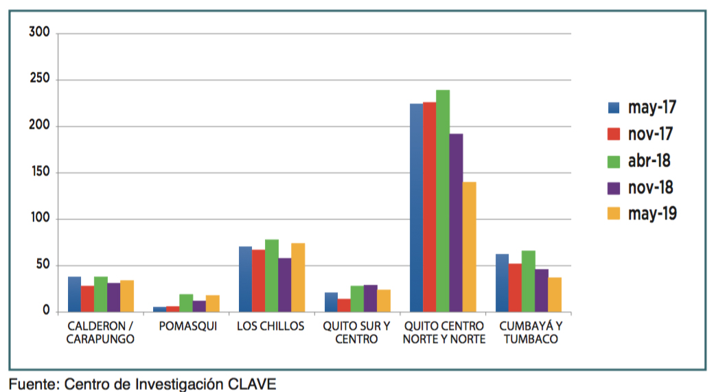 Si bien es evidente que cada sector geográfico tiene vocaciones distintas en cuanto al segmento socio económico al que apela, los siguientes gráficos demuestran que la oferta se ha mantenido prácticamente estable en la franja de clase media típica, como son las zonas del Valle de Los Chillos, Pomasqui, Calderón y Carapungo, mientras que se observa un descenso en lo que corresponde a las zonas con mayor precio de venta, como son Quito Norte, Cumbayá y Tumbaco.