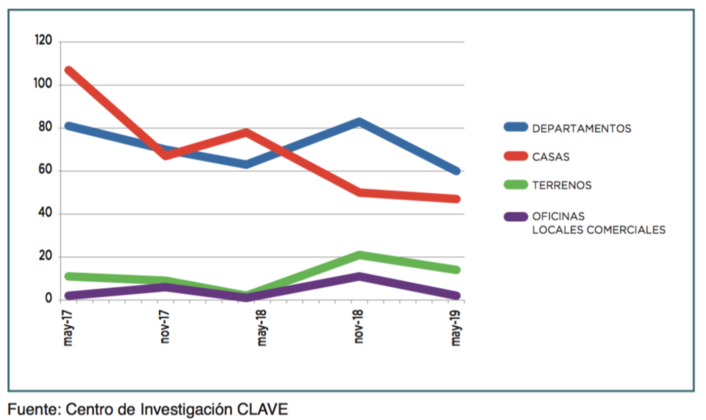 En cuanto a la oferta de inmuebles desagregada por rango de precios, hay una disminución generalizada a mayo 2019, aun en el segmento enfocado en vivienda de interés social y público, pues la demora en la implementación de las políticas del gobierno puso a los constructores en ambiente de pausa.