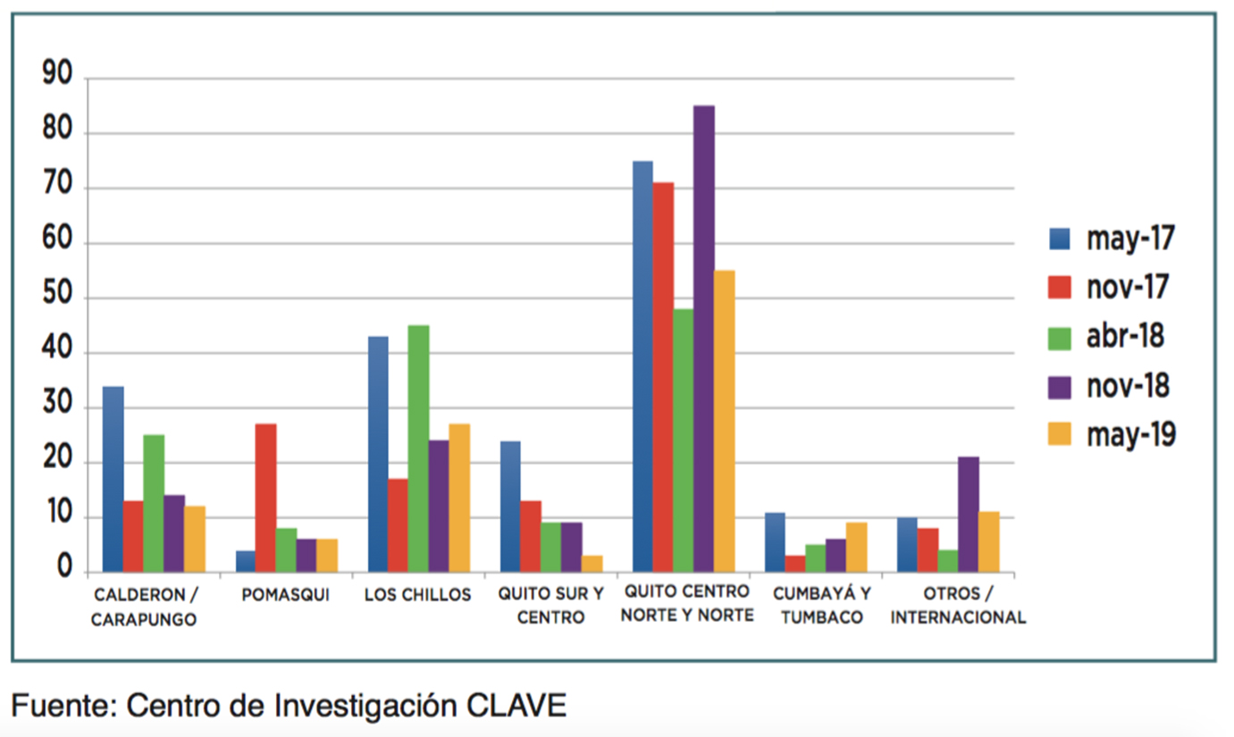 Las ventas durante las Ferias analizadas en este muestreo, catalogadas por ubicación geográfica, demuestran que los dos sectores de mayor apetencia del mercado son los valles de Los Chillos (clase media típica), Cumbayá y Tumbaco (clase media alta y alta). Los demás se mantienen relativamente estables o descendiendo.