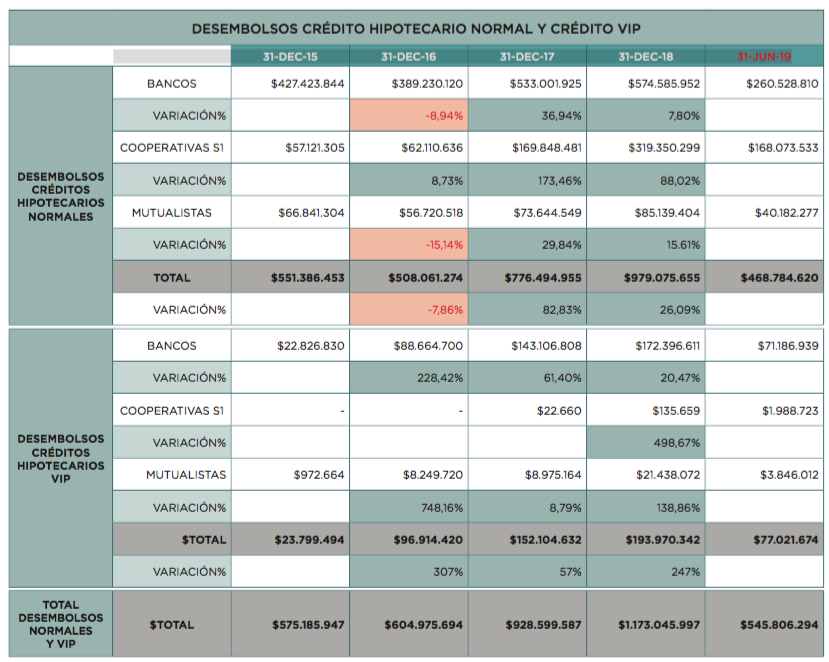 Los desembolsos año a año en créditos hipotecarios, más los recursos destinados a financiar la compra de vivienda de los sectores económicos más vulnerables del país (créditos VIP), se reflejan en el cuadro a continuación.