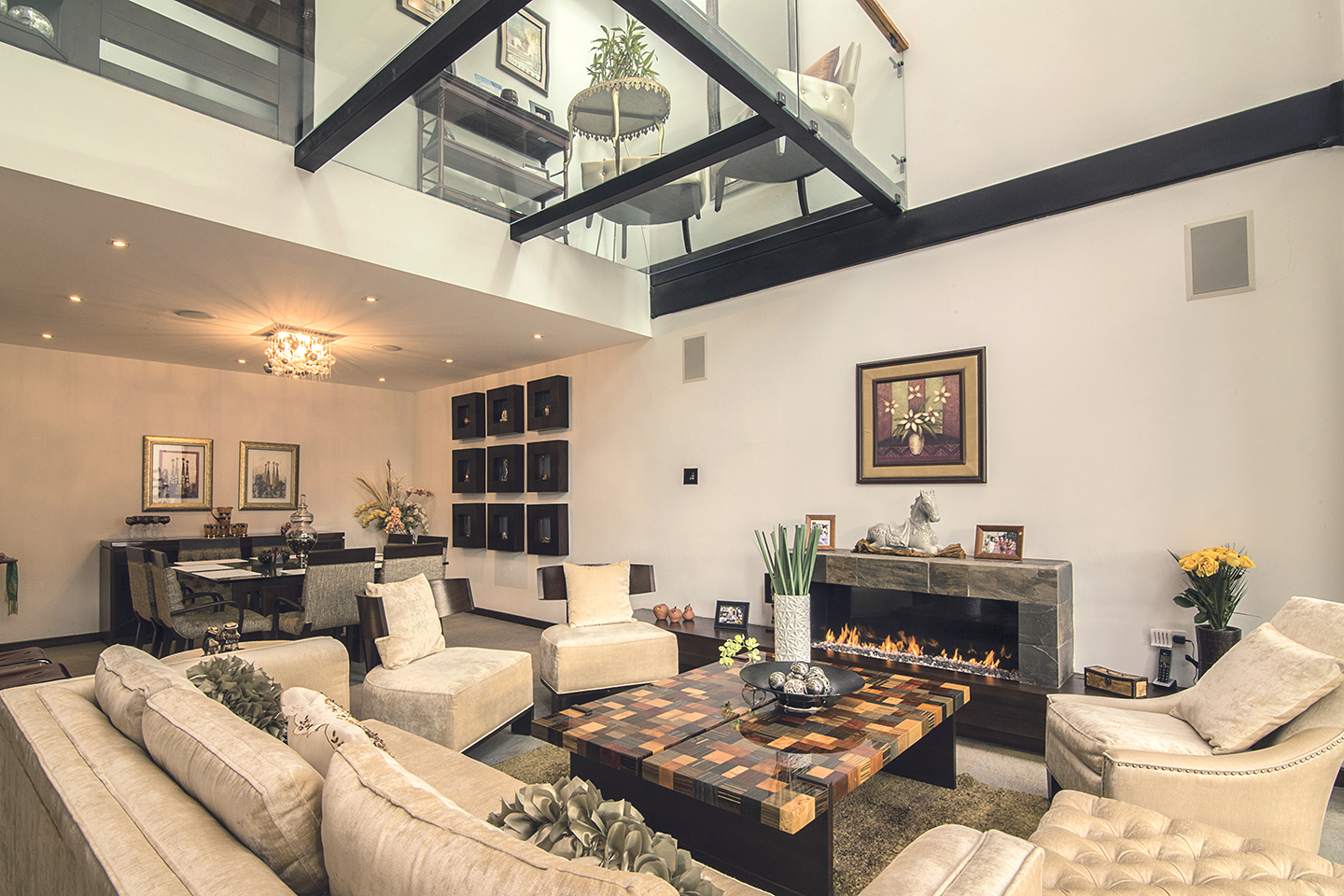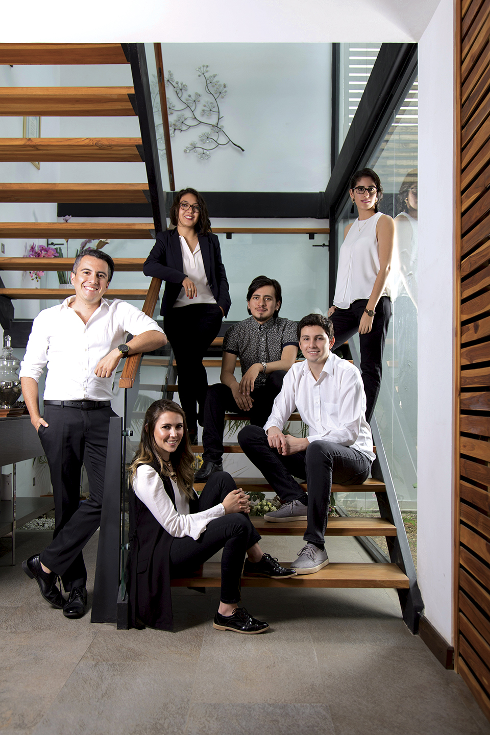 Para aprovechar los elementos de la naturaleza y sus bondades, nos comenta Andrés que el equipo de diseño del inmueble incluyó un sistema de recirculación de agua donde el líquido, depositado en un espejo de agua exterior, se filtra para regresar y caer suavemente bañando a una pared de vidrio ubicada en el hall de ingreso, misma que distribuye y separa armoniosamente los espacios internos de la casa.