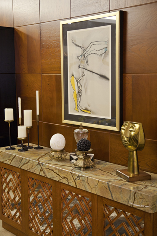 Muchas piezas de la casa guardan una historia o anécdota especial, una de ellas es una obra de arte de Edgar Carrasco. “Fue la primera y única compra que hicimos con las cuotas que nos dieron por nuestro matrimonio. Me acuerdo que yo me enamoré de esos cuadros y los quería para mi casa a toda costa. Oswaldo no estaba de acuerdo en gastar tanto en arte cuando teníamos muchas otras prioridades, y fueron el motivo de nuestra primera pelea como casados, pero finalmente los compramos”, dice. “Luego, cuando me quejaba de que no me alcanzaba el presupuesto para algo, él me llevaba de la mano y me sentaba frente a los cuadros y decía, ‘aquí está la plata que necesitas’. Nos moríamos de risa, pero no me arrepiento ni un segundo de haberlos comprado, son mi pieza de arte favorita”.