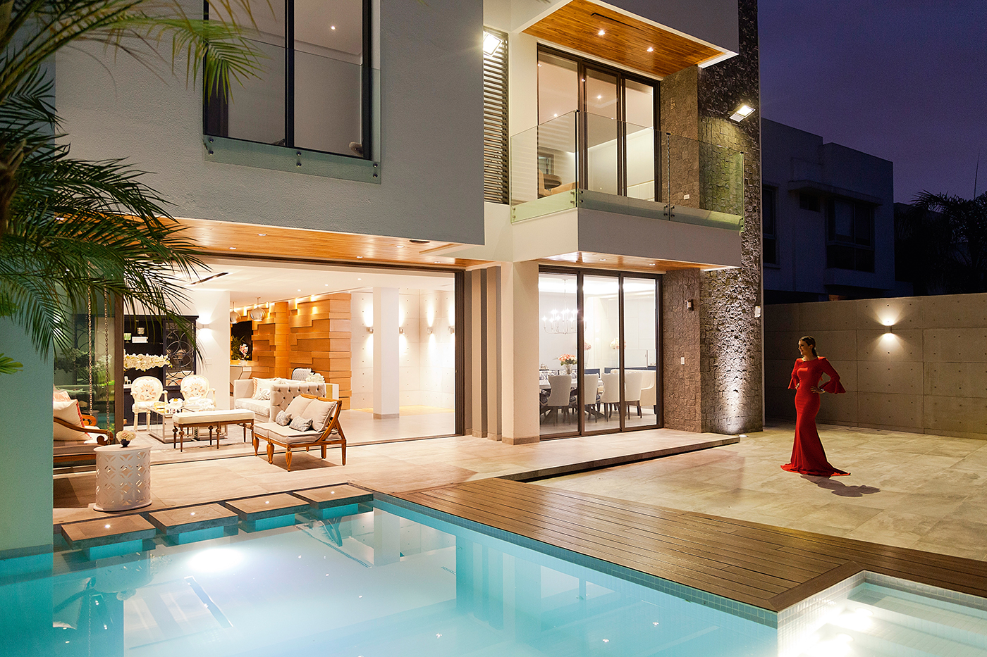 Por otro lado, paneles corredizos juegan entre la sala y el comedor para integrar los ambientes interiores con el exterior, traduciéndose en un solo y acogedor lugar. Una sala exterior y la piscina se llevan el protagonismo en esta zona que está diseñada para aprovechar el aire libre.