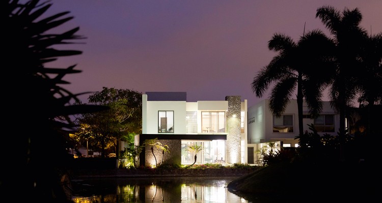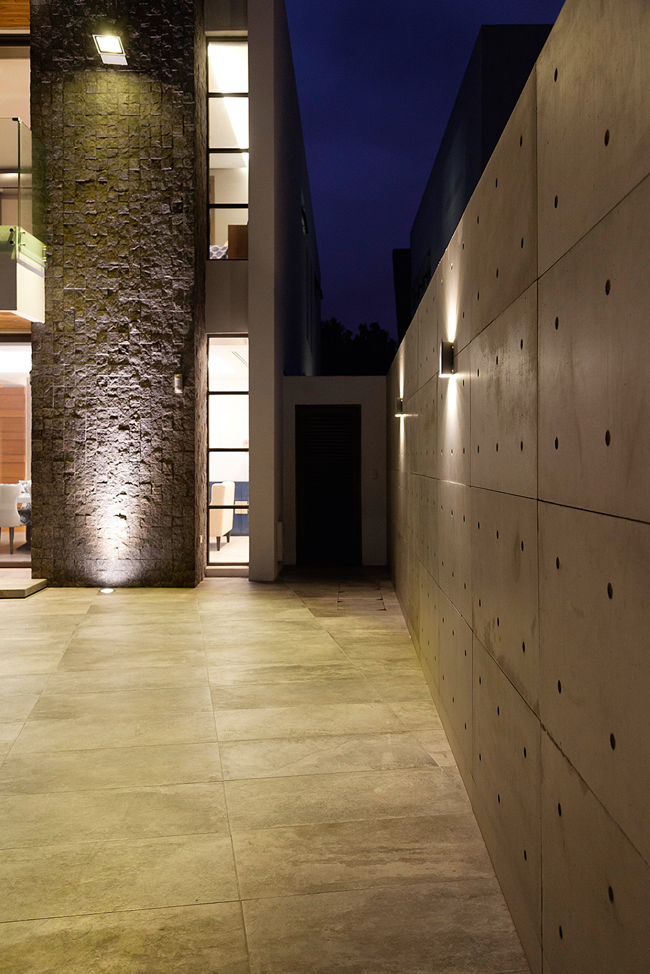 Las líneas rectas definen esta casa, y la armonía en su simetría es evidente. De corte moderno y con exquisitos acabados, se perciben cambios de textura en los materiales, y las volumetrías juegan un papel importante pues brindan movimiento a las fachadas.