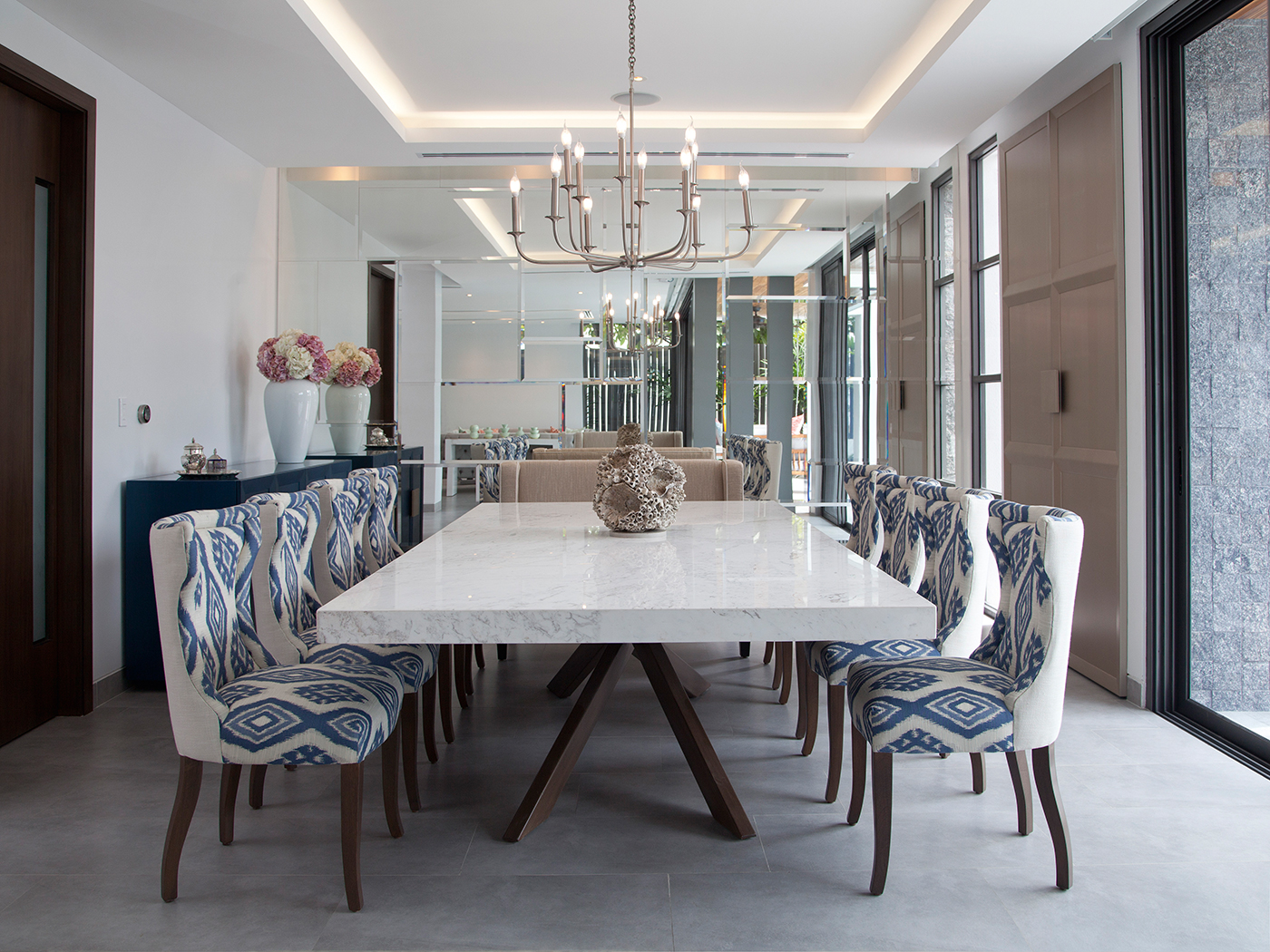 La decoración de la casa tomó dos años. “Si no nos gustaba algo lo mandábamos a pintar, no nos quedábamos satisfechos por pereza al cambio”, agrega Ana María. “El trabajo fue muy detallado y minucioso. Se revisaron paletas de opciones para cada una de las áreas que se trabajaban, incluso cada uno de los knobs o agarraderas de los muebles son distintos unos de otros; los hay de bronce, de cuarzo, de cerámica, pintados a mano, etc.” En definitiva, detalles que están hechos para el pleno deleite de los dueños de casa.