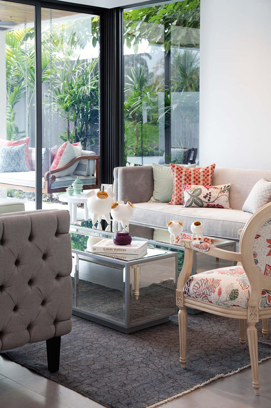 “Por ejemplo, si elegíamos una textura afelpada, tenía que estar en un elemento poco torneado, de formas más rectas y duras, o si hay flores en dos sillas, frente a ellas hay mesas totalmente cuadradas de colores plateado y gris. El secreto está en la mezcla proporcional de elementos”. Las telas de la tapicería y los cojines fueron seleccionadas una por una, y pensadas para que los espacios comulguen a perfección en cuanto a colores y texturas.
