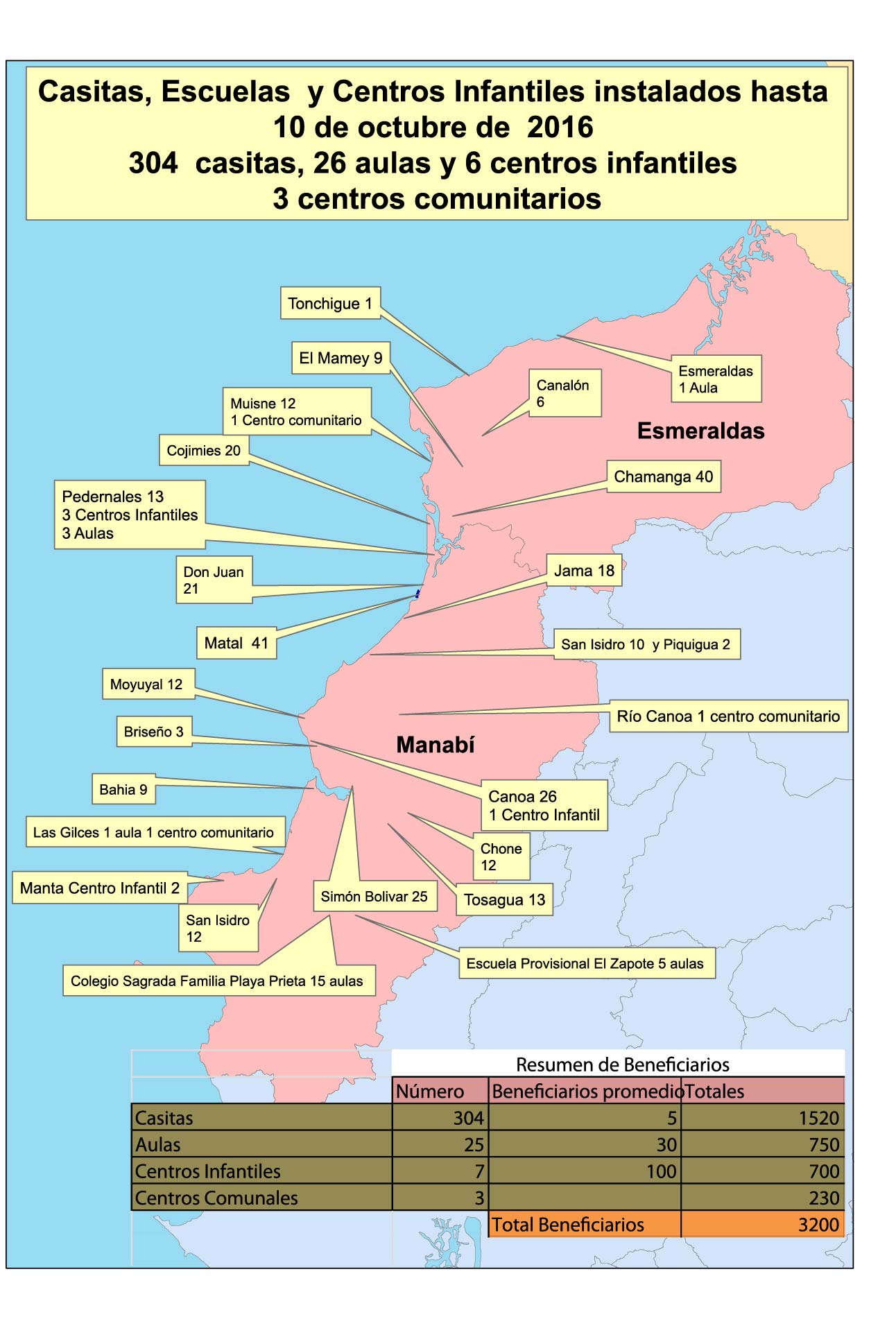 Las primeras 20 estructuras se enviaron a Chamanga, en la provincia de Esmeraldas. El envío y montaje de las primeras 50 casas se dio gracias a la donación de Paul Sorensen Icaza, un amigo de la pareja que creyó en el proyecto. Pero el puntal que permitió que mucha gente se involucrara realizando donaciones fue la red social antes mencionada.