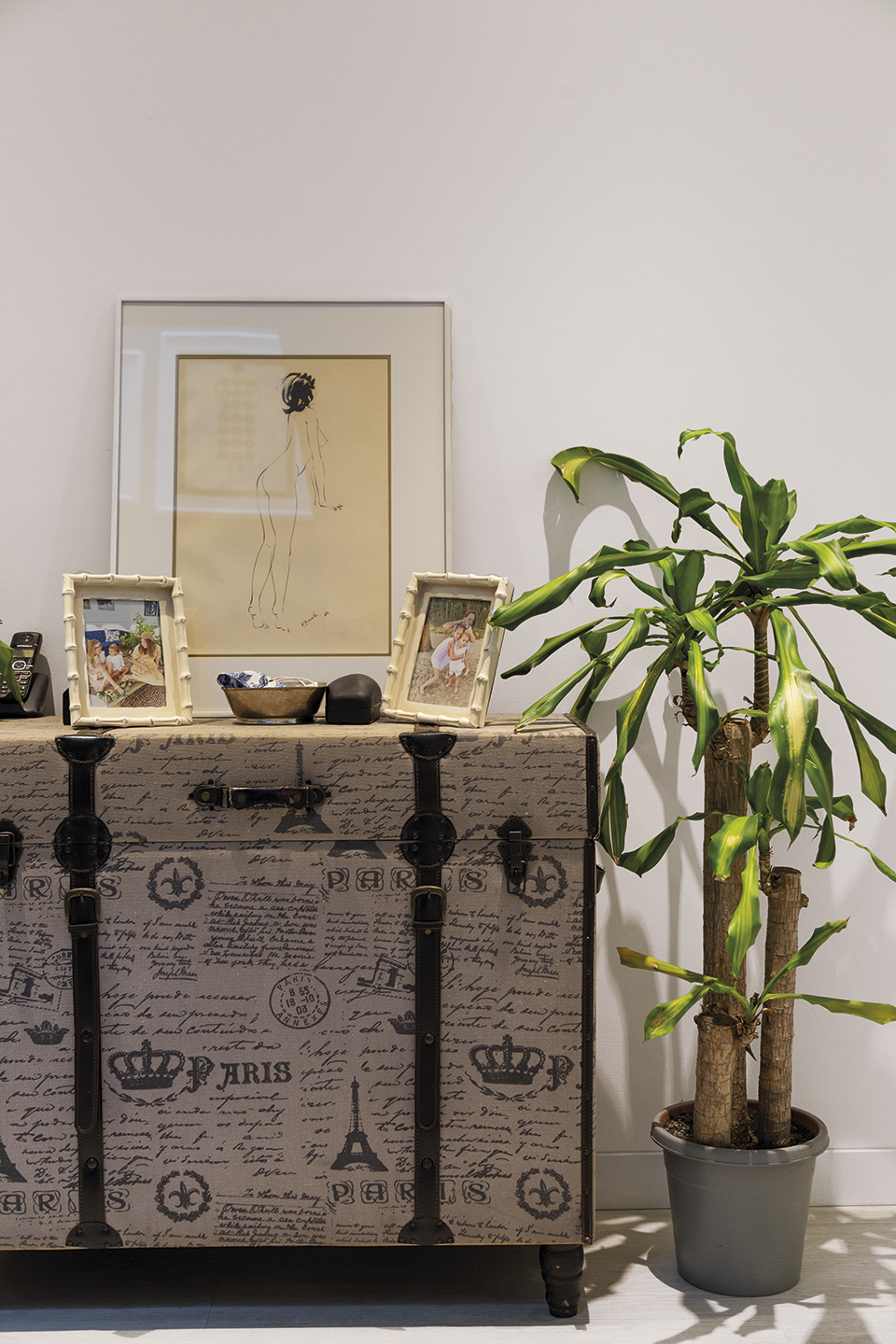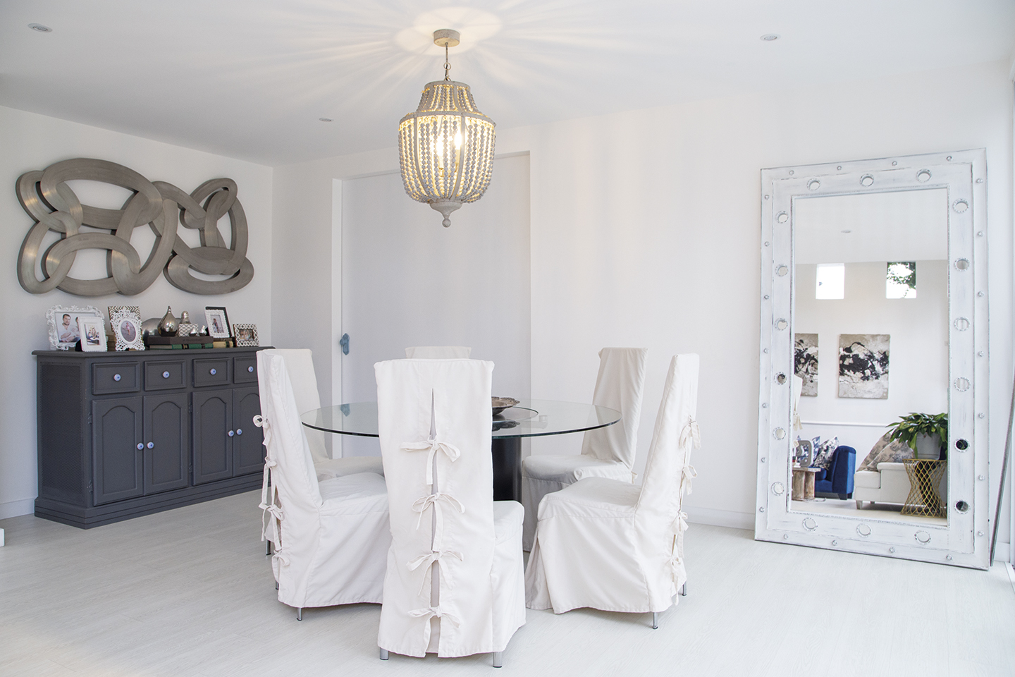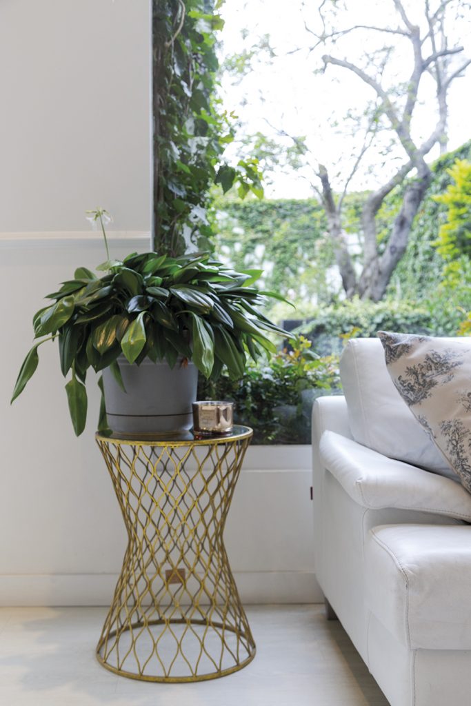 Mi paleta de colores es neutra. La ventaja de estos tonos es que permiten destacar otros detalles, por ejemplo en la sala, el sofá azul rey y la alfombra animal print. Me encanta el yeso y por eso tenemos una cantidad de molduras hechas por artesanos que han trabajado en las iglesias del centro de Quito. Fuimos minuciosos con los detalles para tener piezas únicas, con identidad, como la mesa roja hecha a mano que hay en el exterior, que además hace un hermoso contraste con el verde de nuestro jardín. Los espacios luminosos, la conexión entre áreas sociales internas y externas son parte de nuestro estilo de vida