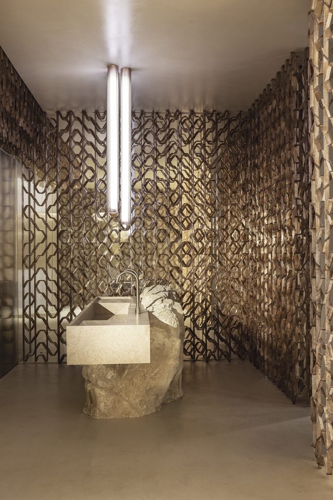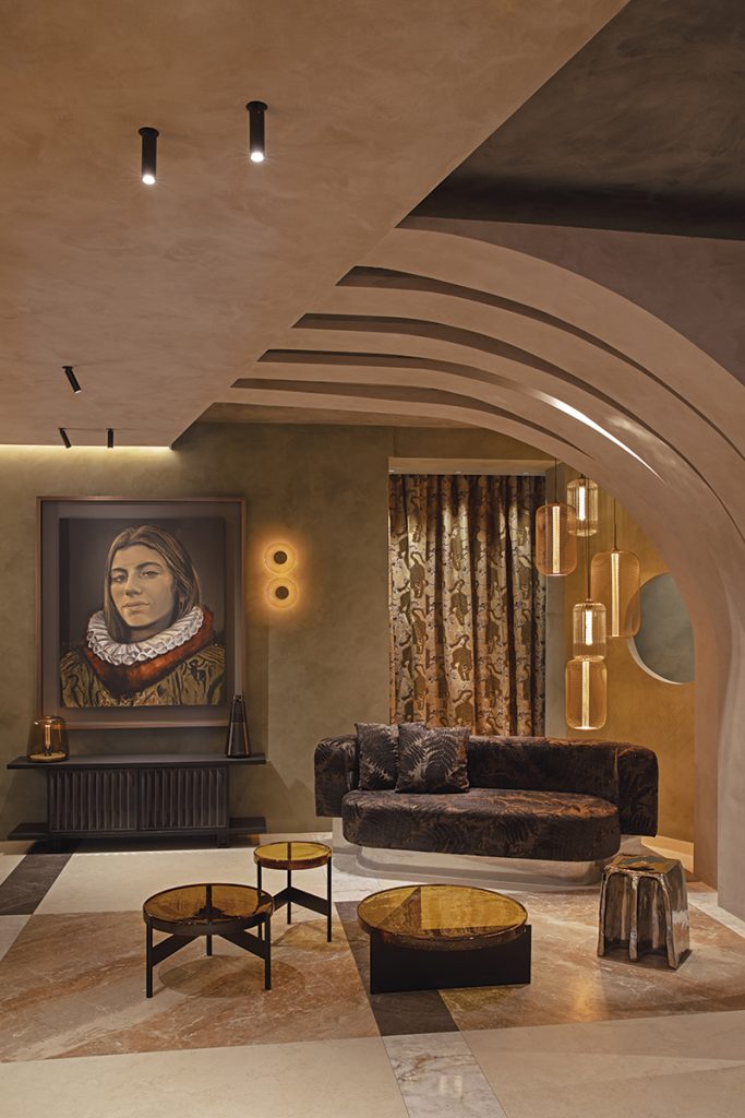Uno de los espacios que mejor encarna esta visión es ‘Sic Parvis Magna’, del estudio madrileño S de Studio. Este dormitorio está inspirado en la Roma imperial. Columnas macizas, hornacinas con iluminación museística y revestimientos que alternan metal oxidado y piedra texturizada componen una atmósfera solemne, casi sacra. Con arcos, y una paleta de grises matizados por dorados envejecidos, el espacio se presenta como un templo del descanso. La cama central, enmarcada por una estructura semicircular, flota bajo una iluminación controlada por sensores de luz natural, ajustando el ambiente a los ritmos del día. “Queríamos recuperar la idea del dormitorio como templo personal”, explican Paola y Katja Hexel, autoras del espacio. El resultado es una oda a lo tectónico, donde el ornamento no es añadido, sino inherente al material.