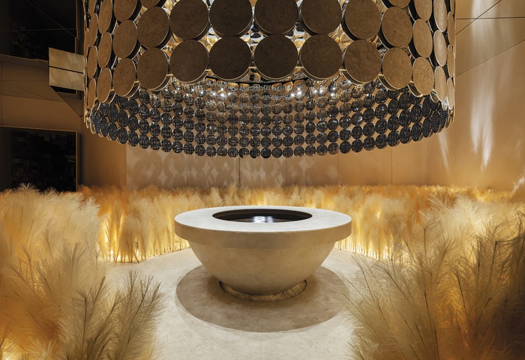 Si algo ha dejado claro esta edición es que el lujo contemporáneo tiene raíces profundas. Así lo demuestra Miguel Muñoz en su lobby ‘Esencia Gran Hotel’, una interpretación moderna del recibidor de los grandes hoteles de antaño. Muñoz apuesta por biomateriales: un revestimiento de paja centeno-trenzada a mano y cerámicas esmaltadas en tonos almagres dialogan con una escultura central tallada en alabastro. El diseñador ha trabajado con talleres de Castilla-La Mancha para recuperar técnicas en desuso. Este lobby diseñado para Legado Artesano de Castilla-La Mancha es una oda al saber hacer ancestral. La paleta en tonos barro y tierra cocida, combinada con piezas de cerámica y textiles bordados a mano, genera una experiencia inmersiva que resignifica el concepto de lujo.