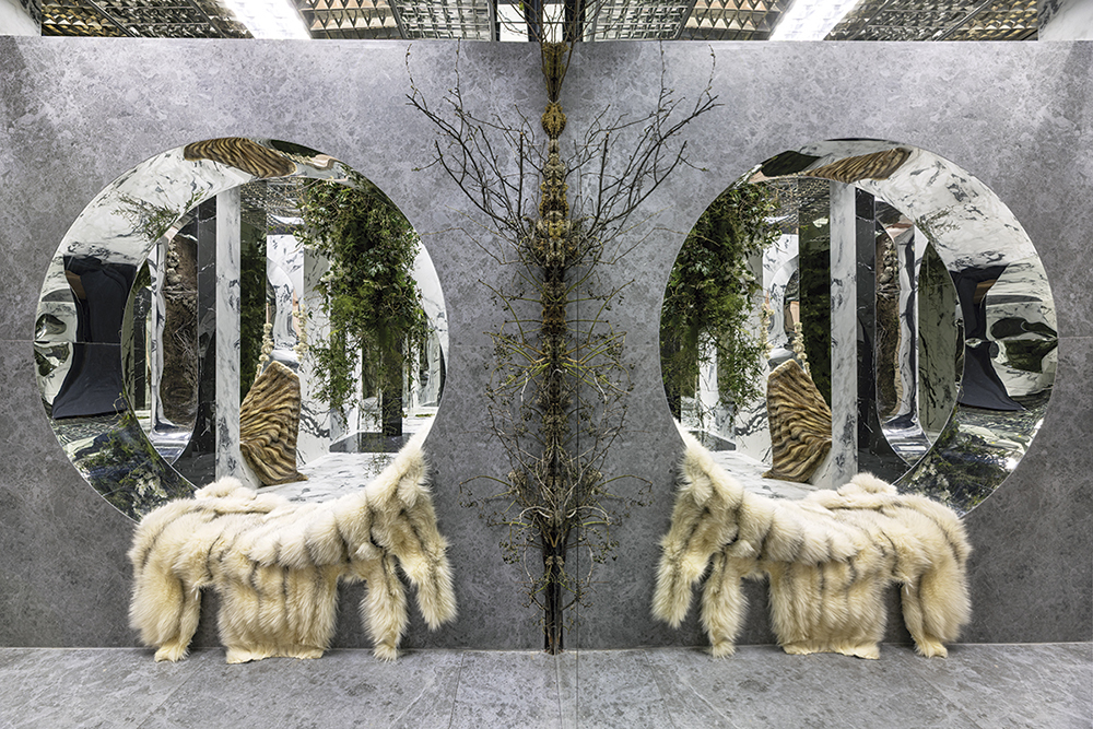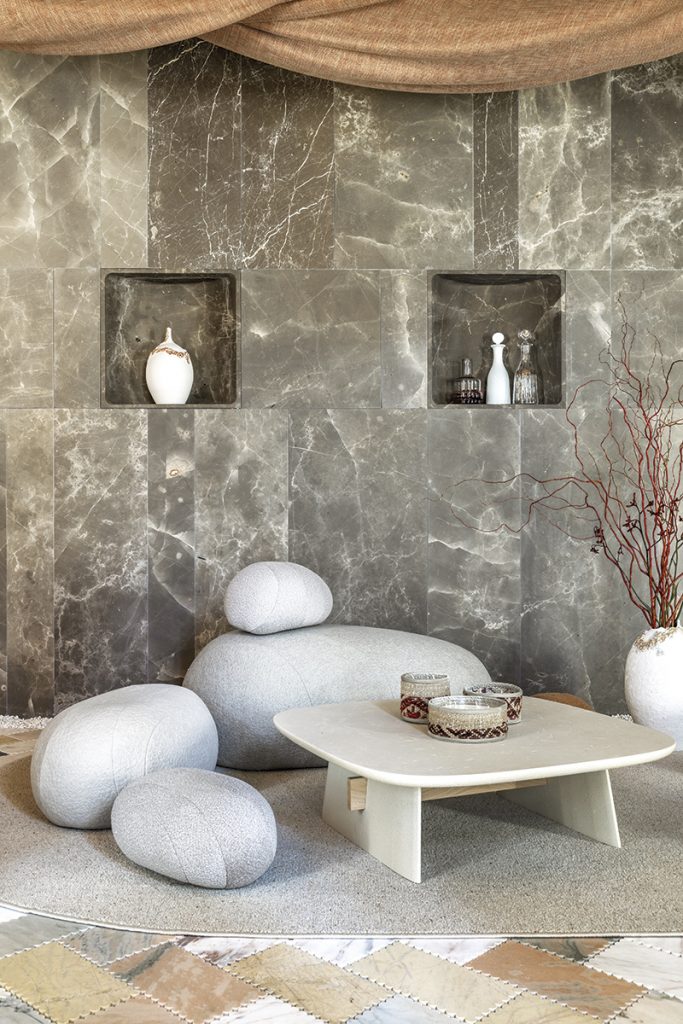 Si hay algo que define esta edición, es la exaltación de la materia como principio y fin del diseño. Desde piedras naturales hasta tejidos de fibras vegetales, pasando por mármoles de corte escultórico y pigmentos elaborados artesanalmente, cada rincón ha sido concebido como un manifiesto de lo sensorial.