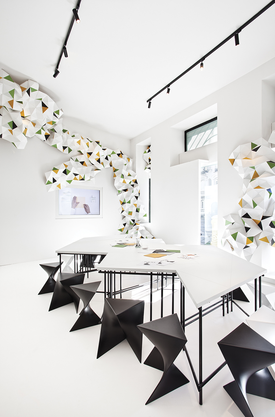 Los pasillos de este señorial edificio nos conducen a otro espacio, uno en el que el color blanco y sus formas atípicas se llevan el protagonismo. Se trata del proyecto presentado por Pepe Leal que se basó en la presentación del nuevo perfume de Loewe Solo Origami. “Jugando con el plegado del papel, hemos diseñado un espacio de aristas y líneas poliédricas concebido como una caverna que recorre el visitante, amplia en un principio, pero que se va estrechando, al final del recorrido, hasta encontrarse con el prototipo del frasco de la nueva fragancia de Loewe”. La atmósfera conseguida con la suma de cada una de las formas y su disposición le hizo acreedor la Primera Mención del Jurado.