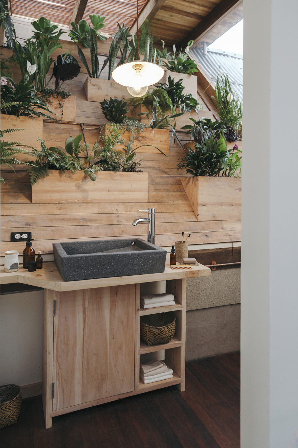 Madera reciclada, adobe, piedra, metal y cerámica. Procuramos que todo tenga el menor impacto posible al medio ambiente y que sea lo más natural. Hay muchas cosas de segunda mano, y otros objetos, por ejemplo la alfombra, es hecha con tintes naturales. Dimos mucha importancia a conservar los materiales en su estado puro y natural, sin cubrir las imperfecciones. Por ejemplo, la madera está sin lacar, solo está tratada con aceite y cera.