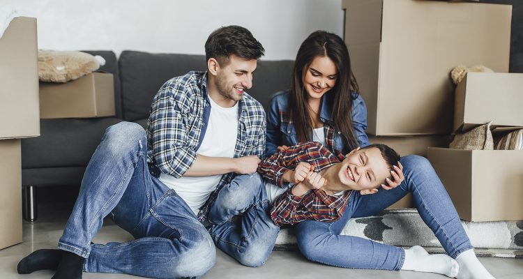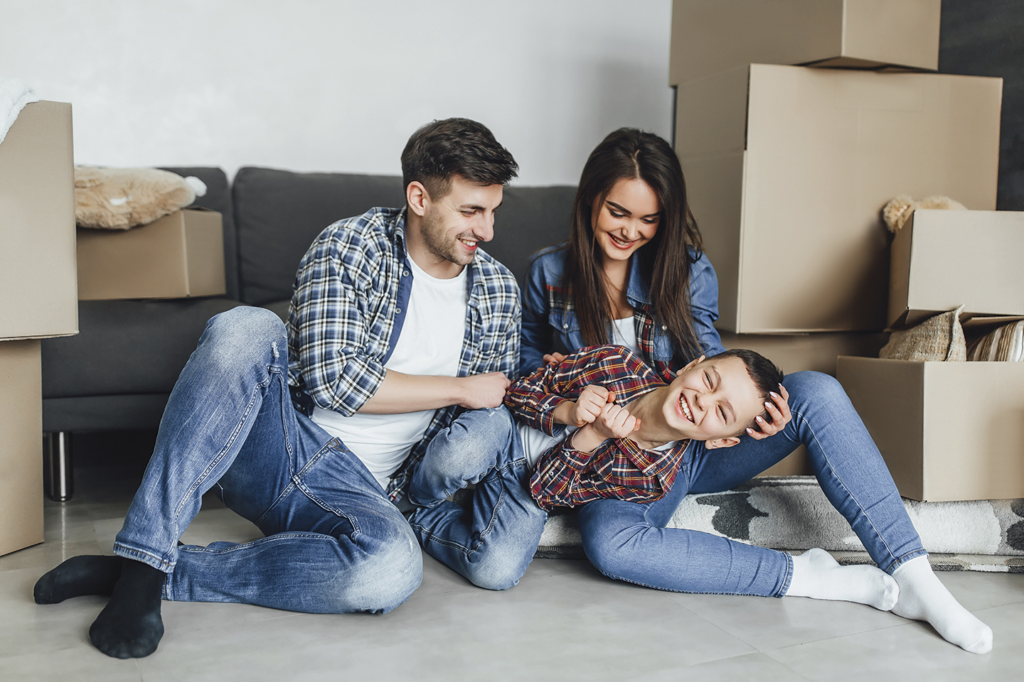 Moving to a new home. Happy family with cardboard boxes palying with son!