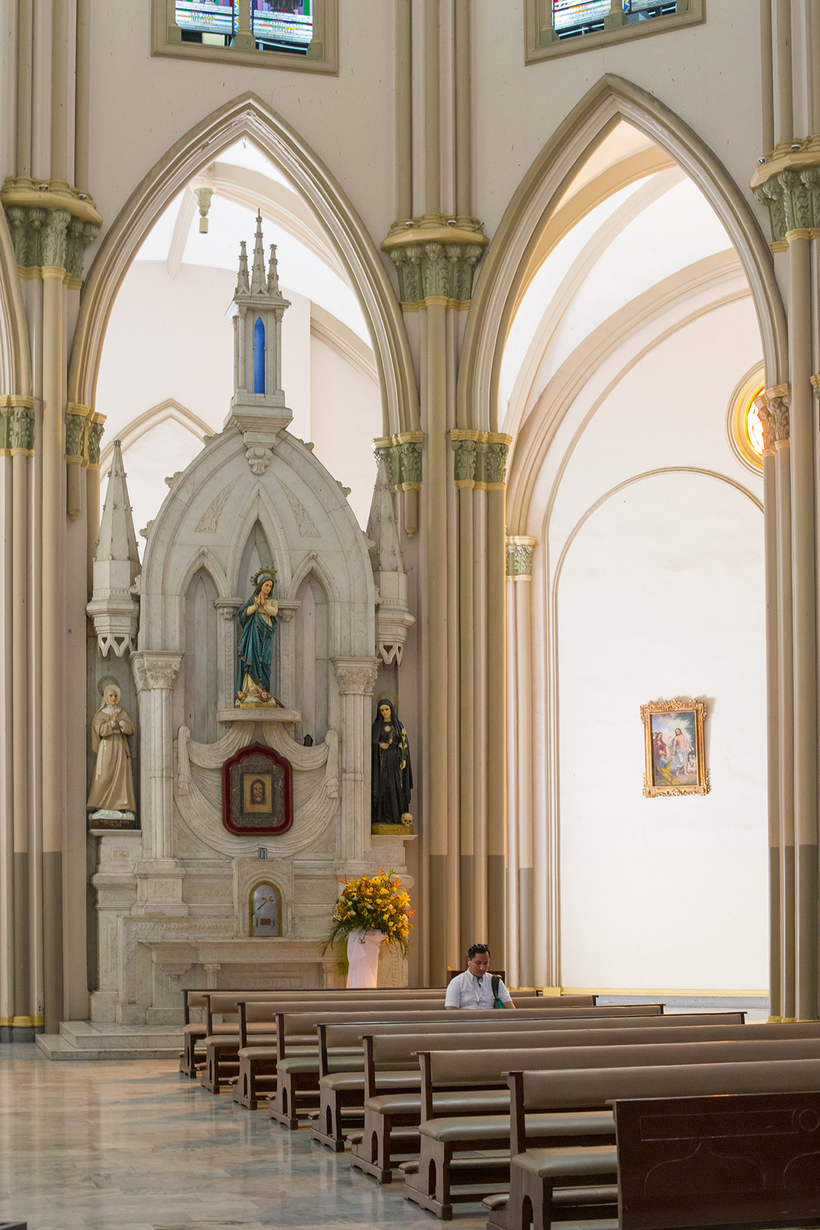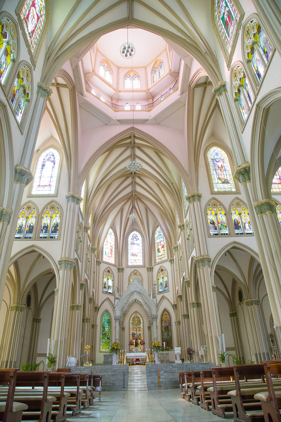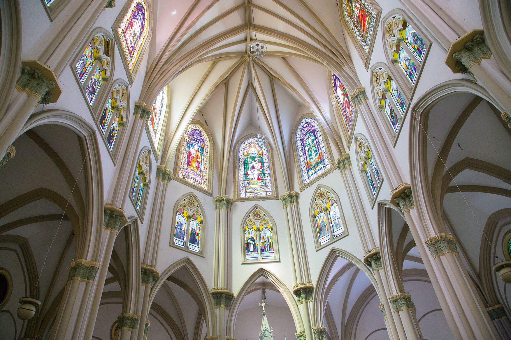A más de su imponente altura, pilares, históricos pasillos, trabajadas esculturas, pinturas y balcones, los vitrales propios del estilo gótico resaltan su belleza. Son 126 piezas de colores intensos, que contienen las imágenes de los apóstoles y patriarcas del Viejo y Nuevo Testamento, así como también de santos y beatos latinoamericanos.