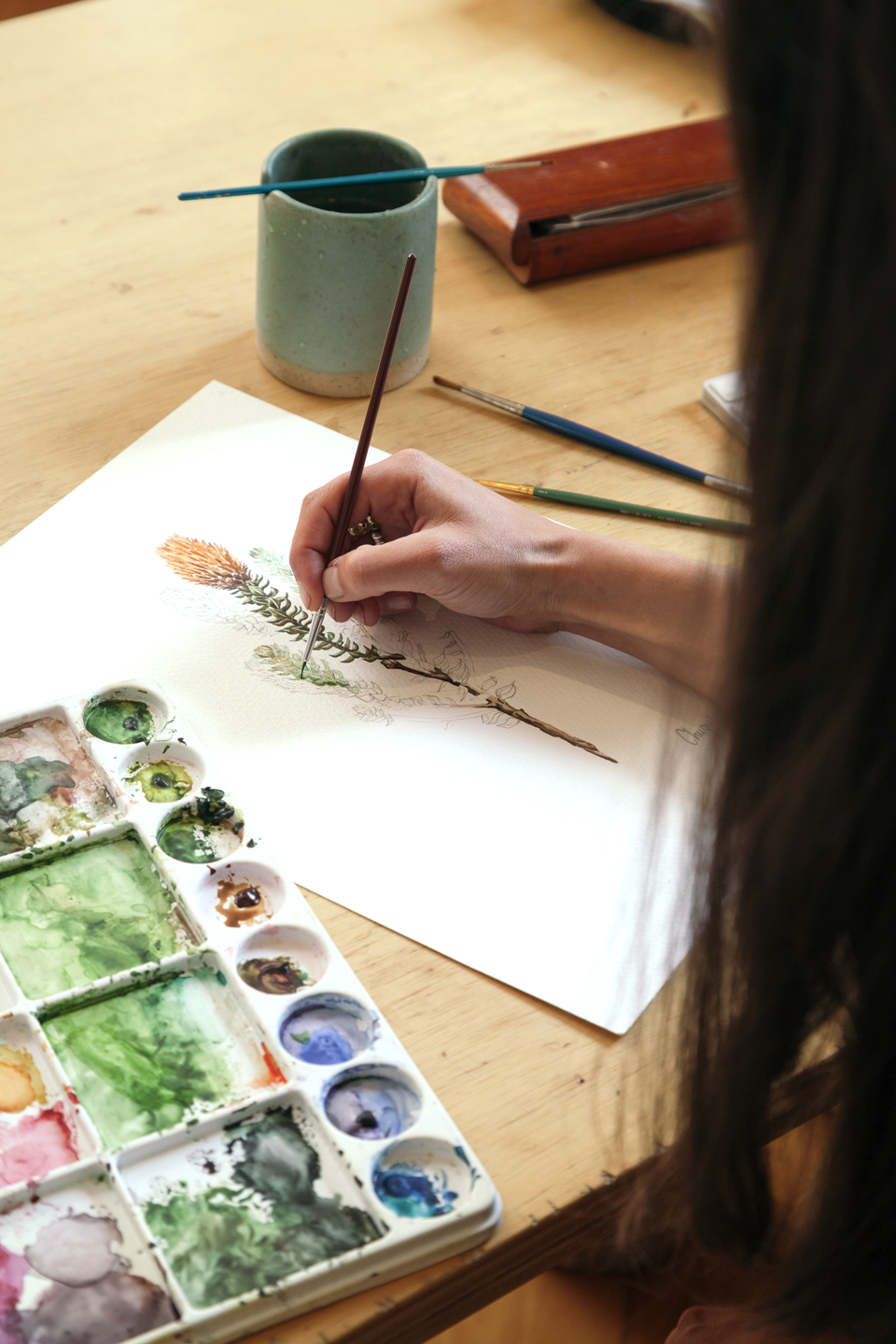 Desde chiquita me gustó explorar con diferentes materiales. Me considero una persona autodidacta, súper manual y creativa. Cuando era adolescente empecé a pintar con óleos, acuarelas y hacía ilustraciones botánicas, ahora es una de las cosas que más me apasionan.