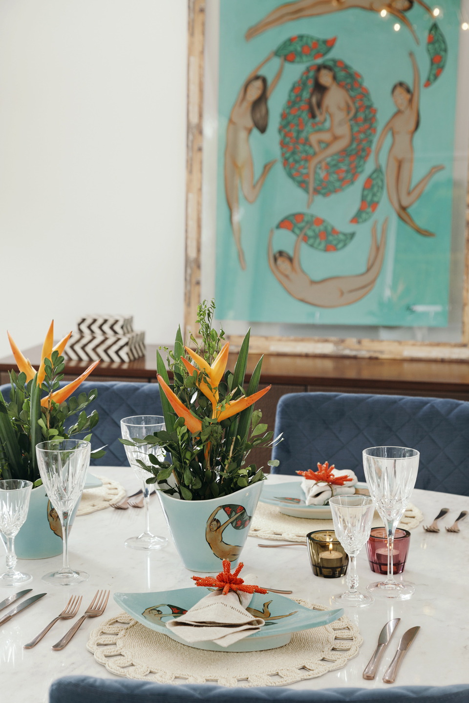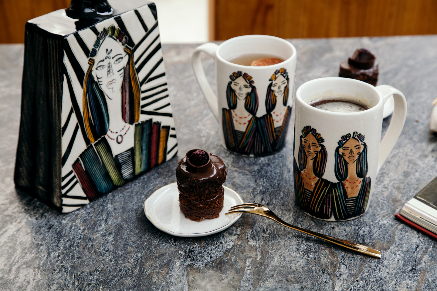 Son 60 piezas con una variedad de platos, cuencos, vasos, tazas, jarros, teteras, mantequilleras, saleros y pimenteros, floreros, etc. A la gente le encantó, a pesar de que la cerámica aún no es tan conocida y popular en Guayaquil, pero la temática es muy personal y creo que eso los conectó mucho. Las piezas que diseño se adaptan bien en cualquier decoración, tienen un toque folklórico y contemporáneo. No sigo tendencias, mi arte es la manifestación de mis ideales.