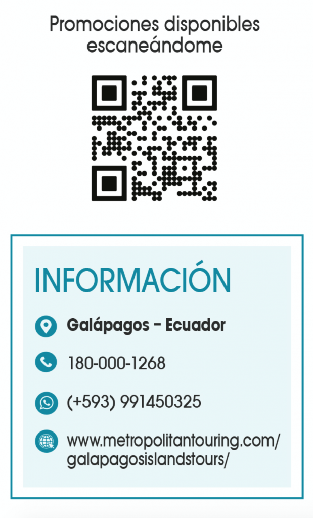 Cada barco operado por Metropolitan Touring se centra en ayudar al huésped a que se conecte con la naturaleza y viva una experiencia inolvidable en este santuario de la naturaleza. Nuestros itinerarios buscan que los exploradores descubran la mayor cantidad de las especies de fauna Big15 (lista de especies silvestres emblemáticas de Galápagos), de la mano de expertos jefes de expedición y acompañados por un equipo de guías naturalistas apasionado, comprometido y con gran experiencia.