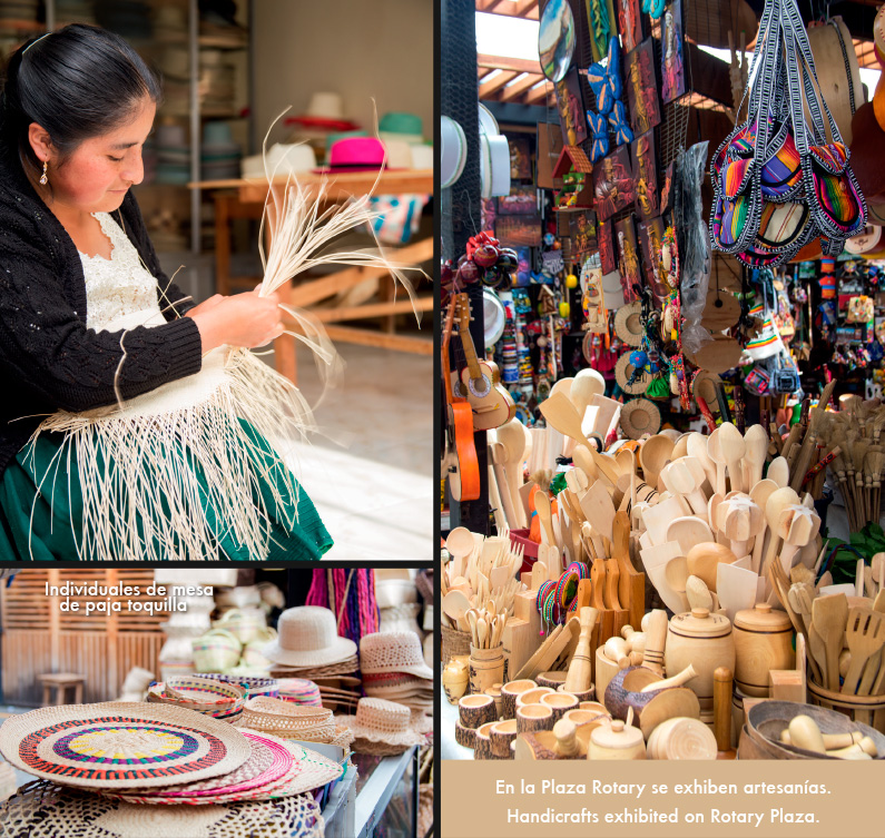 En la Plaza Rotary se exhiben artesanías de madera, barro, hierro y canastas de carrizo; elementos que son, en su mayoría, utilizados para decoración de interiores. También hay accesorios elaborados con paja toquilla como individuales de mesa, tapetes, muñecas, carteras. Además, preste atención si le gustan los bordados, encontrará ropa con detalles hechos a mano.