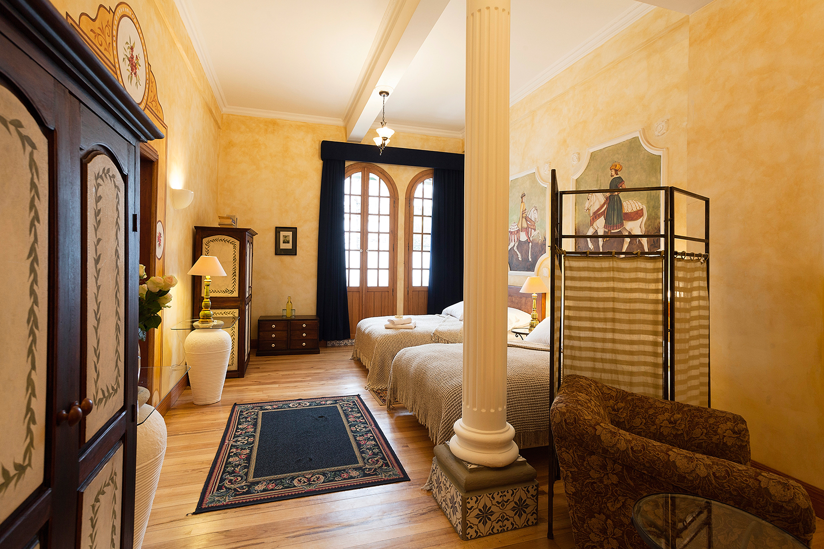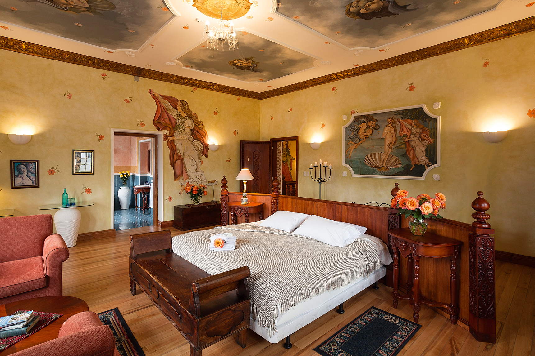 Thanks to the magical realism (realismo mágico) other works from Botticelli come to life in the walls of the rooms and bathrooms, the elements of the paintings freely emerged from them to the places they see feet, as it happens with the Birth of Venus in room one, the Allegory of The Spring in room three, the goddess Athena in room five, the Judgment of Paris in room six, among other famous Botticelli paintings. A historical and cultural voyage, where every piece belongs to a vision that was masterfully designed and harmoniously created.