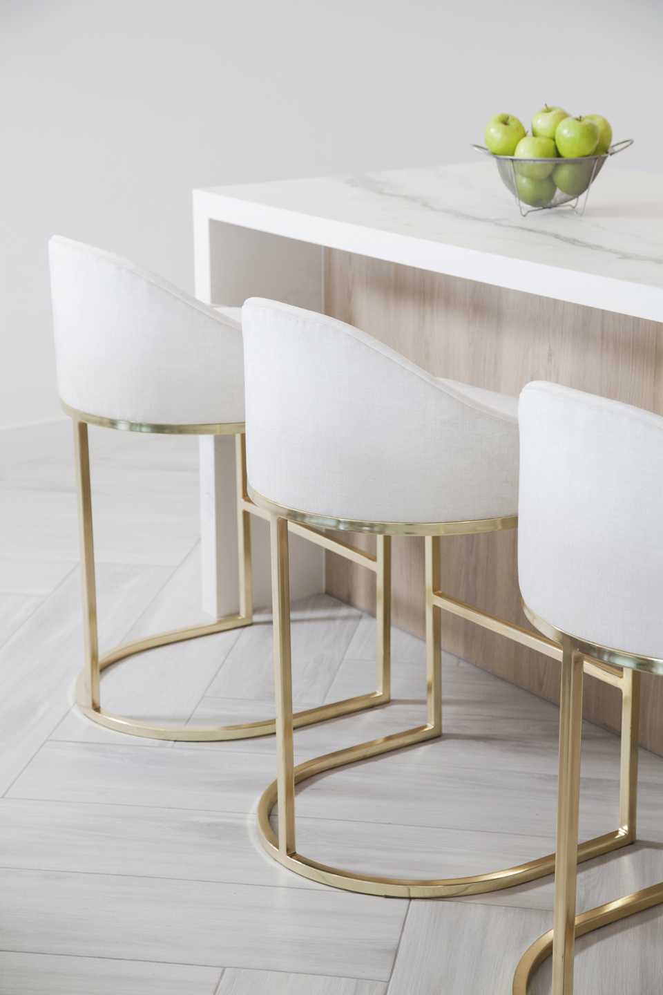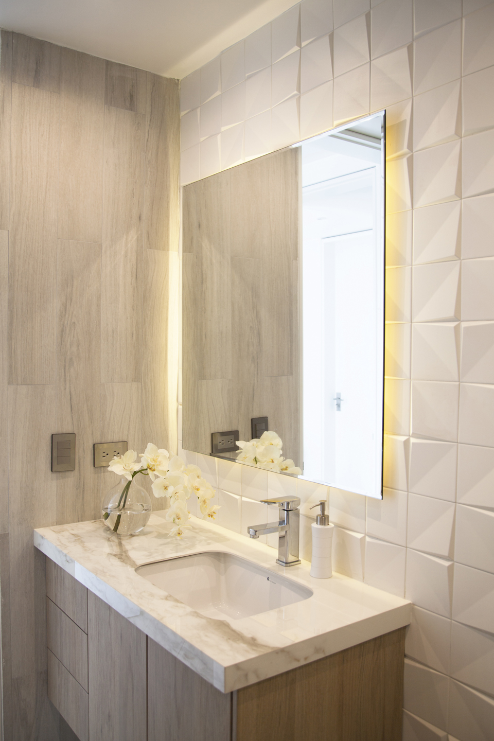Nos enfocamos mucho en esta parte. Colocamos puertas y barrederas blancas. Cambiamos todo el piso y pusimos un porcelanato simil de madera color blanco en todo el departamento para darle mucha claridad. La idea fue colocarlo en forma de fishbone para lograr textura y contrarrestar la frialdad del claro. Quitamos el baño que estaba en la cocina y abrimos esta área, porque era un espacio cerrado, e hicimos una isla con un mesón de material itopker mate para integrar al área social y dar más amplitud. Todos los muebles que pusimos fueron diseñados por nosotros.