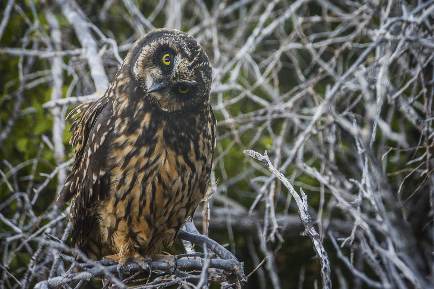 Otro maravilloso habitante de las islas es la Lechuza de Galápagos. Este animal, a diferencia de las lechuzas del mundo, es la única que caza durante el día. La población más grande de este espécimen se encuentra en la isla del norte Genovesa, la isla de las aves, y está ahí porque se alimenta de otras pequeñas aves como petreles y pinzones. No es fácil avistarlas porque su color café amarillento es el perfecto camuflaje entre la vegetación seca y las piedras volcánicas de las islas. Sin duda el hallazgo más importante en nuestra visita a Plazas Sur, y tal vez del viaje entero, fue encontrarnos con una lechuza entre la vegetación de esta isla central donde es sumamente raro verlas, ¡y vaya qué estuvo cerca!
