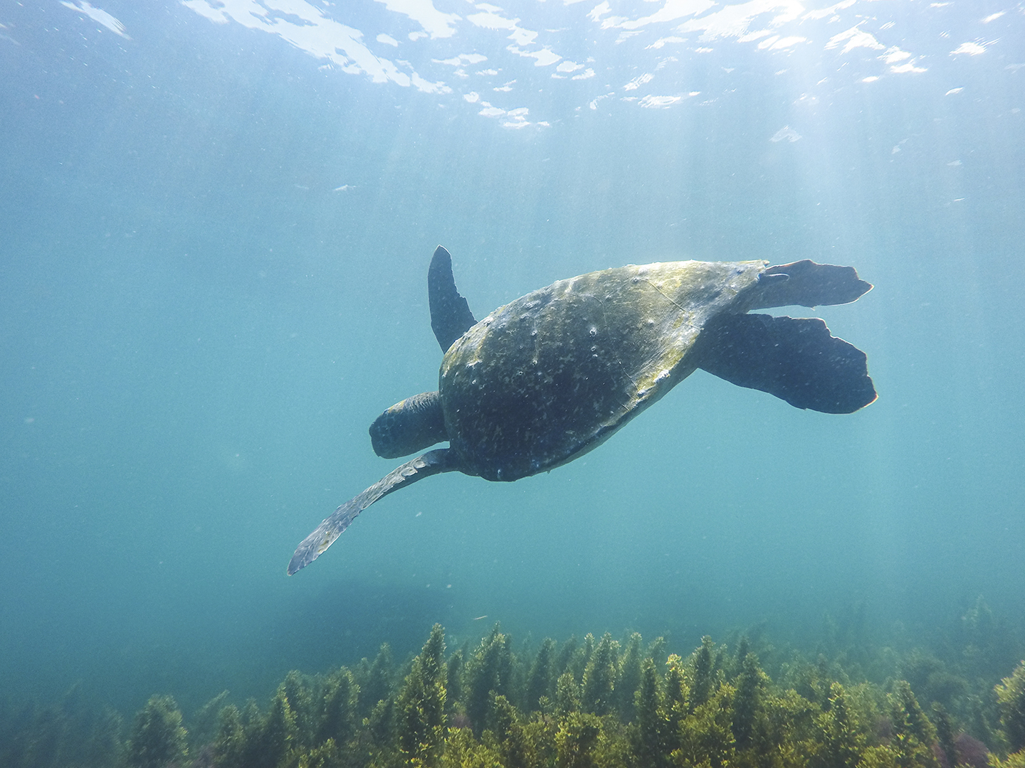 Es uno de los animales más comunes de las islas, y su juguetona forma de ser los hace tan cautivadores que es imposible no mencionarlos. Los lobos marinos son mamíferos que viven en casi todas las islas, y se diferencian de las focas por sus aletas y la movilidad que adquieren con ellas para apoyarse y caminar sobre piedras y arena. Son excelentes nadadores, se alimentan de peces y pulpos, y es realmente un deleite verlos moverse en el agua cuando se hace snorkel. Son muy curiosos y extremadamente veloces. No es raro ser recibido por ellos en los puertos de desembarque, y si hay suerte se puede ver a sus crías muy cerca, como fue el caso en nuestra llegada a Plazas Sur. Eso sí, es muy importante mantener la distancia cuando una hembra está cerca, ya que pueden ser muy agresivas por proteger a sus bebés.